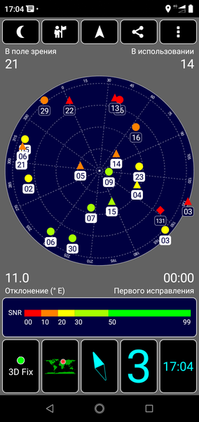 Навигационный модуль работает с GPS (с A-GPS), с отечественной Глонасс, а также с Galileo. Насчет китайской Beidou не совсем ясно, поскольку в спецификациях ее поддержка указана, но тестовая программа спутники Beidou не находит. Первые спутники при холодном старте обнаруживаются небыстро, примерно в течение первой минуты. Магнитный компас, необходимый для работы навигационных программ, в аппарате имеется.