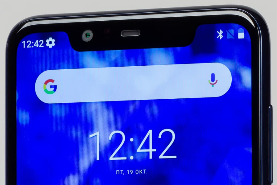 Передняя панель, к сожалению, не получила светодиодного индикатора событий даже несмотря на огромную «челку» (она же «монобровь»). Вырез очень широкий, и на небольших оставшихся по краям кусочках дисплея умещается лишь самый минимум информации, ломая привычный интерфейс Android. Уж лучше бы просто сделали ровный сегмент над экраном безо всяких вырезов — хотя тогда, конечно, цифра диагонали дисплея получилась бы меньше. У фронтальной камеры нет собственной вспышки и нет ИК-подсветки для реализации разблокировки по лицу в темноте, так что такая ширина выреза ничем, кроме стремления подражать iPhone X, не обусловлена.