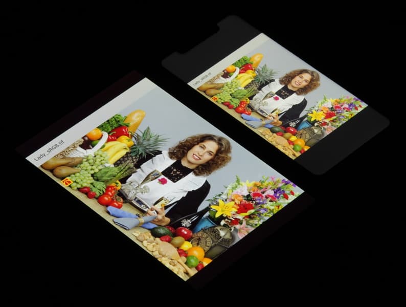 Экран имеет хорошие углы обзора без значительного сдвига цветов даже при больших отклонениях взгляда от перпендикуляра к экрану и без инвертирования (кроме самых-самых темных при отклонении по одной диагонали) оттенков. Для сравнения приведем фотографии, на которых на экраны Nokia 5.1 Plus и Nexus 7 выведены одинаковые изображения, при этом яркость экранов изначально установлена примерно на 200 кд/м², а цветовой баланс на фотоаппарате принудительно переключен на 6500 К.