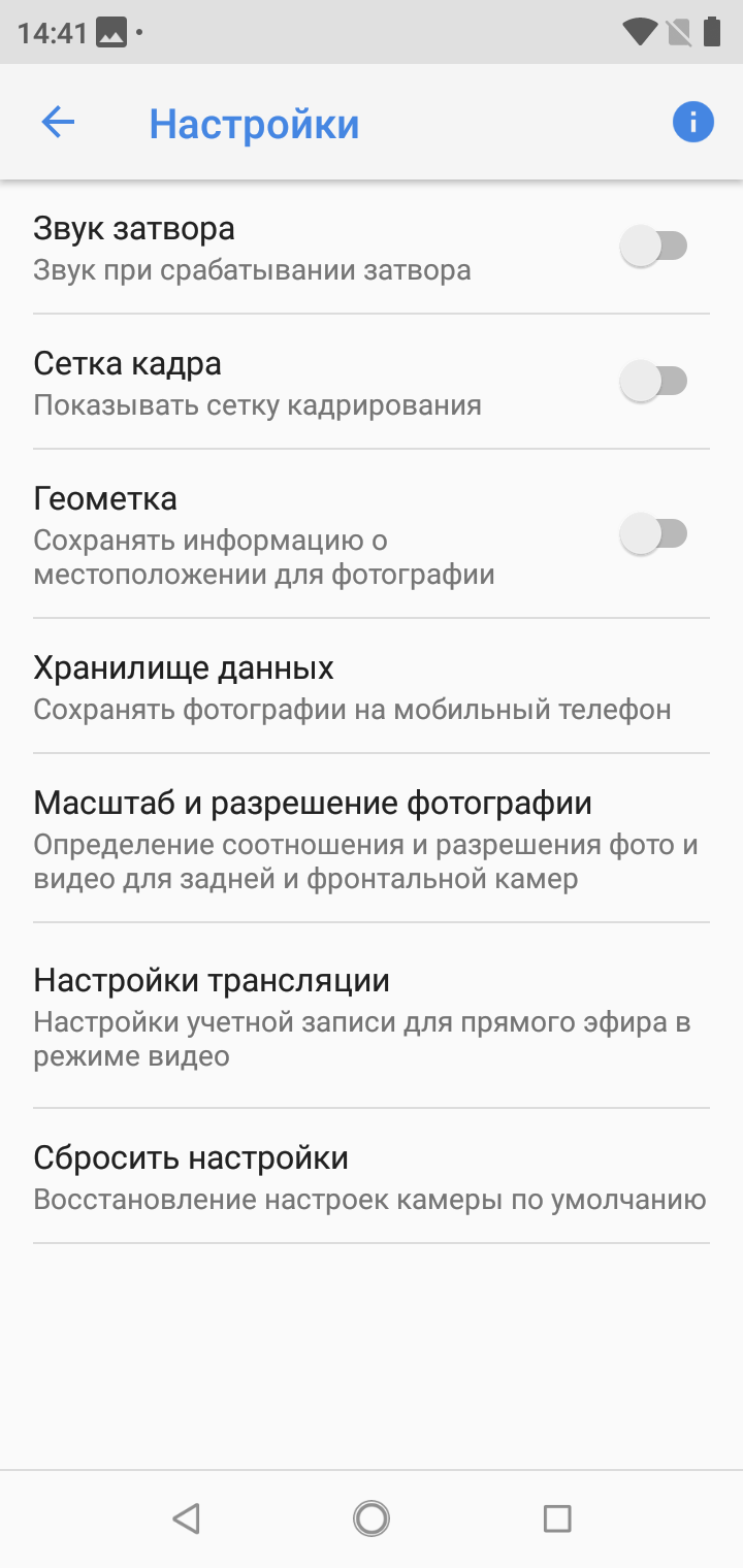 Набор настроек камеры собран в нетипичное для Android меню, которое нам показалось неудобным: пользователя сходу встречает целый ряд однотипных ничего не говорящих квадратных иконок, в которых не разобраться, пока не нажмешь каждую. Этих пиктограмм в быстром меню явно больше, чем надо, в интерфейсах других приложений камер меню понятнее и лаконичнее.