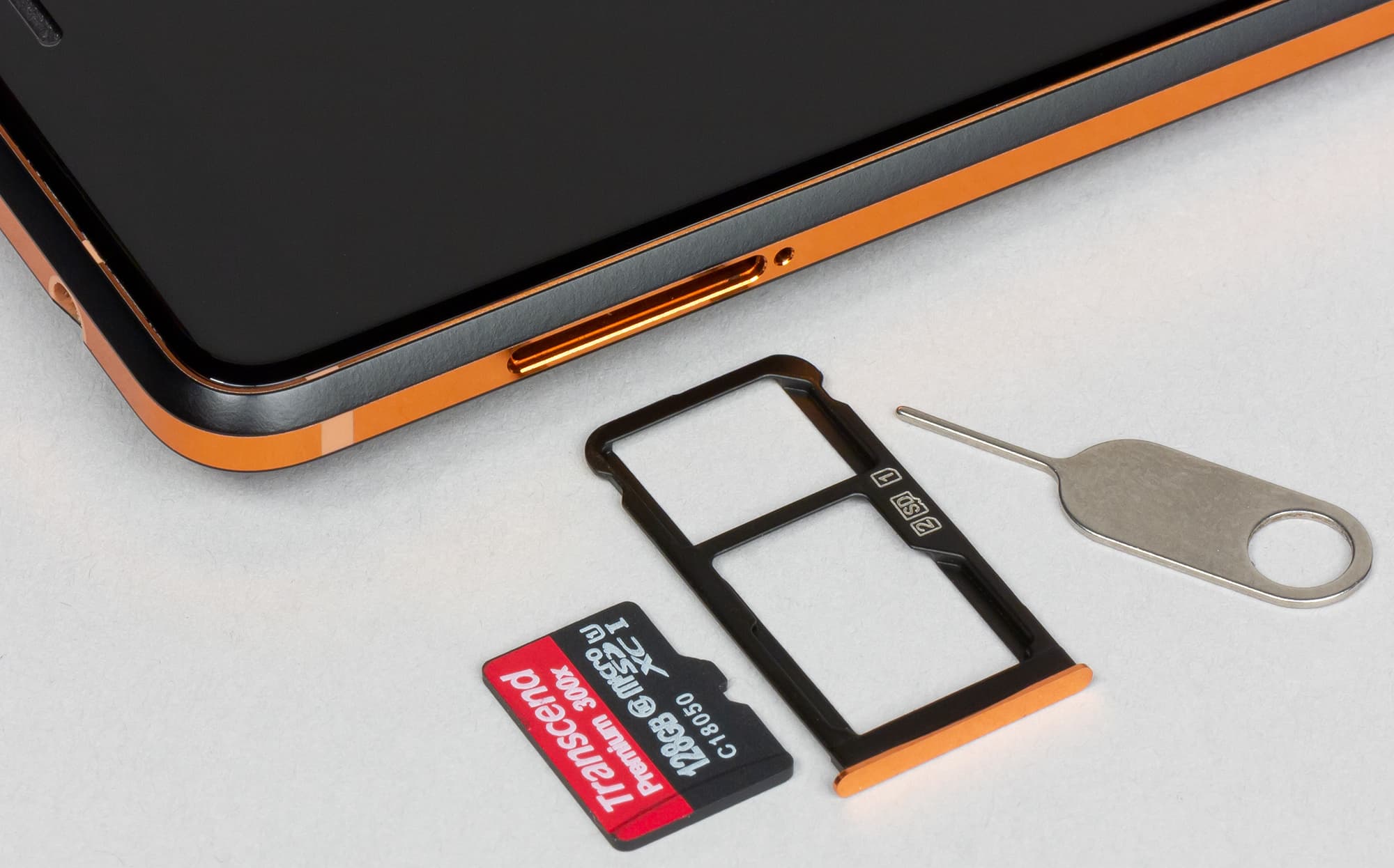 Разъем для карт гибридный, в него можно одновременно установить две Nano-SIM-карты или одну Nano-SIM и одну карту памяти. Поддерживается горячая замена. Проверочная карта объемом 128 ГБ без труда распозналась, однако в качестве внутреннего хранилища отформатировать ее не предлагается. А следовательно, для установки файлов приложений дополнительная память не используется, только для хранения мультимедийных файлов (фото, видео, музыка и т. д.).