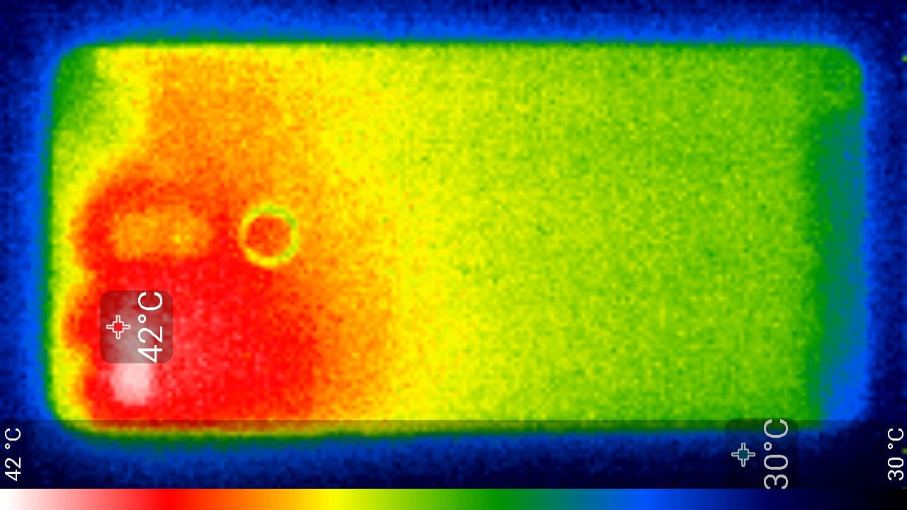 Нагрев больше локализован в верхней правой части аппарата, что, видимо, соответствует расположению микросхемы SoC. По данным теплокамеры, максимальный нагрев составил 42 градуса (при температуре окружающего воздуха в 24 градуса). Такой нагрев нельзя назвать незначительным.