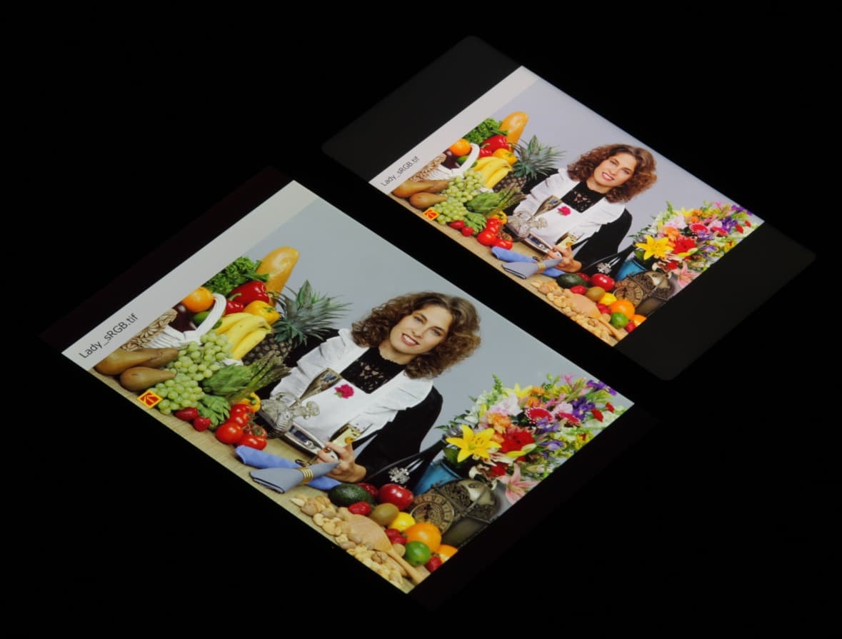 Спектры компонент хорошо разделены, что и обуславливает широкий цветовой охват. Такое мы уже видели в случае, например, Sony Xperia Z2 и других мобильных устройств. Sony указывает, что в этих экранах используются светодиоды с синим излучателем и зеленым и красным люминофором (обычно — синий излучатель и желтый люминофор), что в сочетании со специальными светофильтрами матрицы и позволяет получить широкий цветовой охват. Да, и в красном люминофоре, видимо, используются так называемые квантовые точки. Для потребительского устройства широкий цветовой охват является никак не достоинством, а существенным недостатком, поскольку в итоге цвета изображений — рисунков, фотографий и фильмов, — ориентированных на пространство sRGB (а таких подавляющее большинство), имеют неестественную насыщенность. Особенно это заметно на узнаваемых оттенках, например на оттенках кожи. Результат приведен на фотографиях выше.