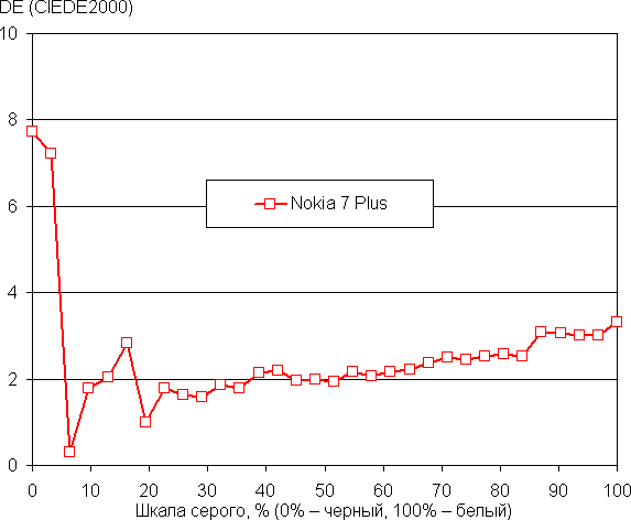 Баланс оттенков на шкале компромиссный, так как цветовая температура существенно выше стандартных 6500 К, но отклонение от спектра абсолютно черного тела (ΔE) ниже 10, что для потребительского устройства считается приемлемым показателем. При этом цветовая температура и ΔE мало изменяются от оттенка к оттенку — это положительно сказывается на визуальной оценке цветового баланса. (Самые темные области шкалы серого можно не учитывать, так как там баланс цветов не имеет большого значения, да и погрешность измерений цветовых характеристик на низкой яркости большая.)
