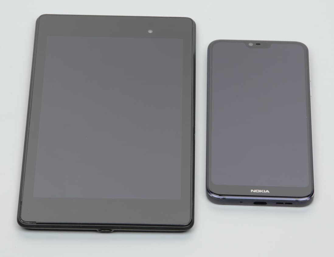 Лицевая поверхность экрана выполнена в виде стеклянной пластины с зеркально-гладкой поверхностью, устойчивой к появлению царапин. Судя по отражению объектов, антибликовые свойства экрана не хуже, чем у экрана Google Nexus 7 (2013) (далее просто Nexus 7). Для наглядности приведем фотографию, на которой в выключенных экранах отражается белая поверхность (слева — Nexus 7, справа — Nokia 7.1, далее их можно различать по размеру):