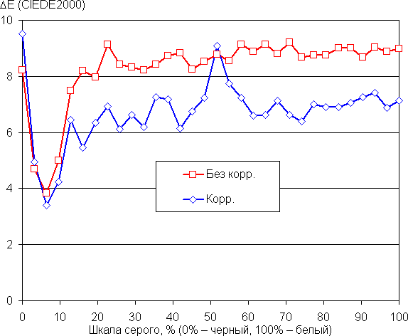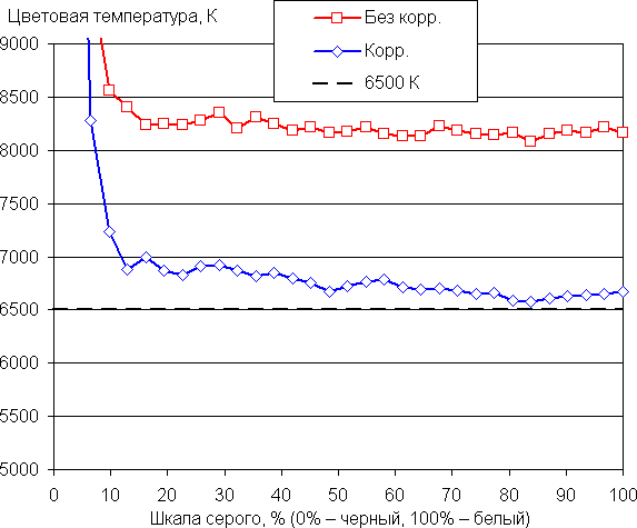 Результат после ручной коррекции (мы сдвинули ползунок в крайнее правое положение) получше (см. графики ниже), поскольку цветовая температура снижается, а отклонение от спектра абсолютно черного тела (ΔE) на большей части шкалы серого остается ниже 10, что для потребительского устройства считается приемлемым показателем. При этом цветовая температура и ΔE мало изменяются от оттенка к оттенку — это положительно сказывается на визуальной оценке цветового баланса. (Самые темные области шкалы серого можно не учитывать, так как там баланс цветов не имеет большого значения, да и погрешность измерений цветовых характеристик на низкой яркости большая.)