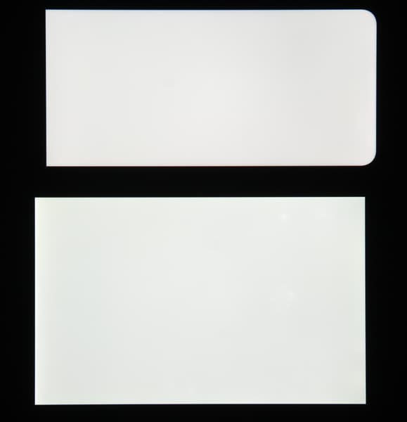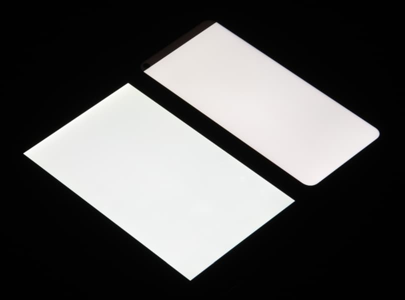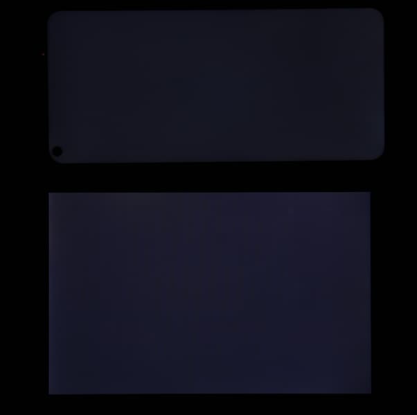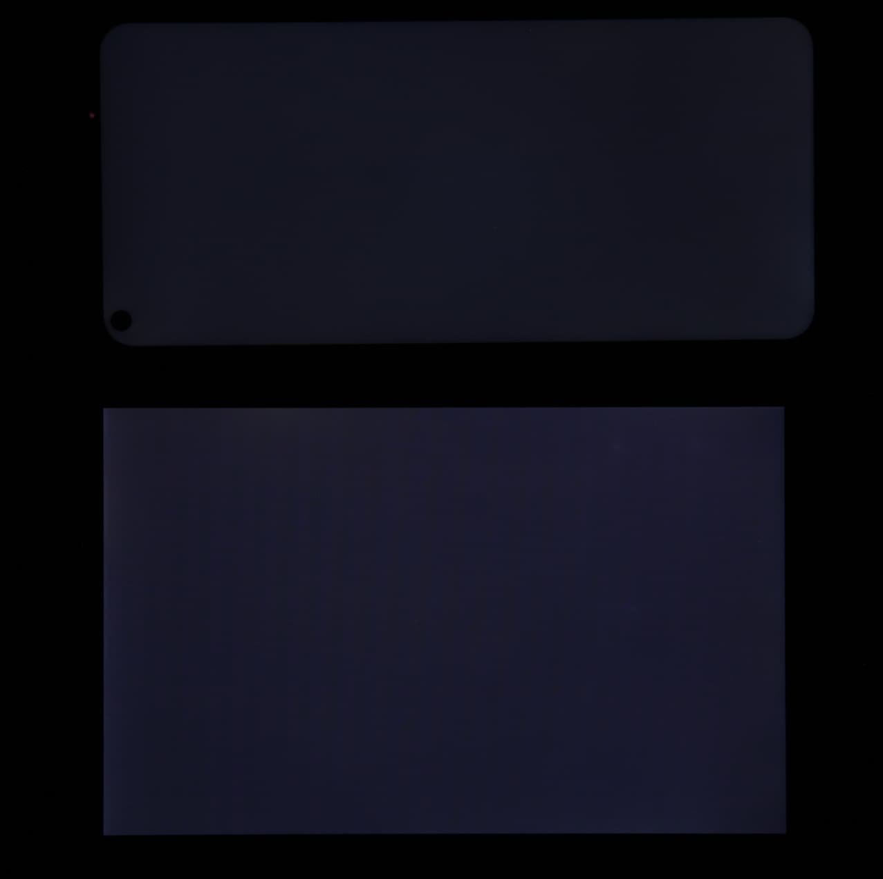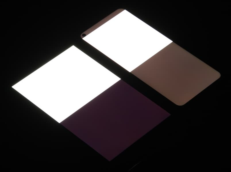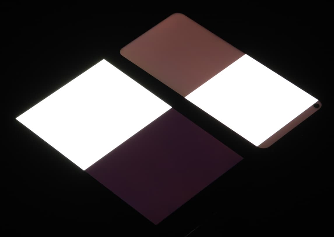 Яркость под углом у экранов уменьшилась (как минимум в 5 раз, исходя из разницы в выдержке), но у Nokia 8.3 5G яркость под этим углом все же чуть ниже. Черное поле при отклонении по диагонали высветляется сильно и приобретает чуть красноватый оттенок. Фотографии ниже это демонстрируют (яркость белых участков в перпендикулярном плоскости экранов направлении одинаковая!):