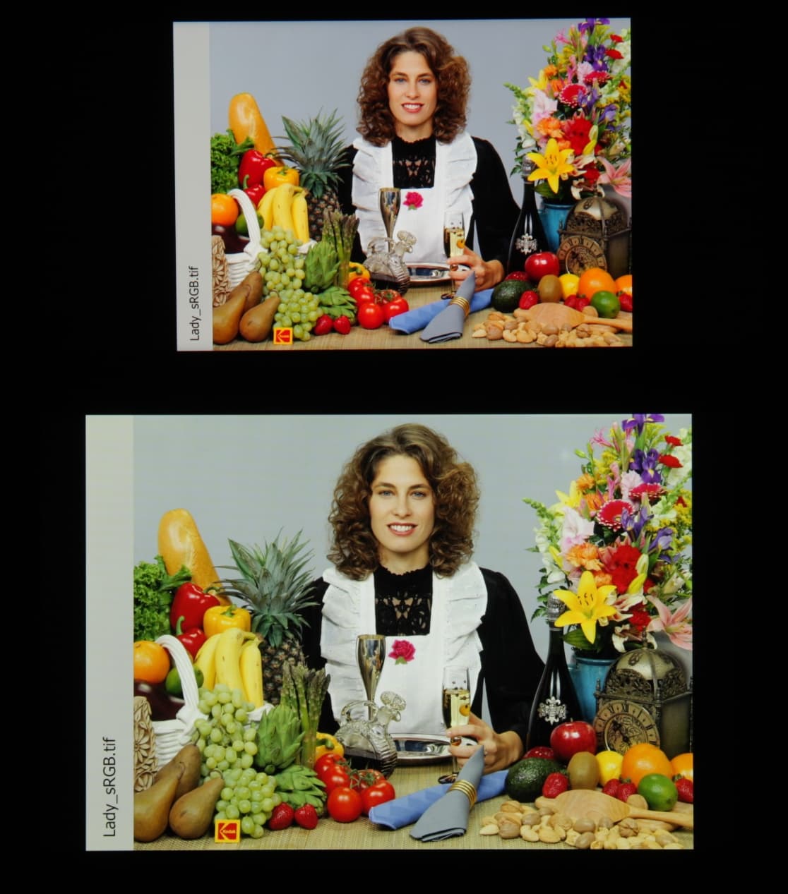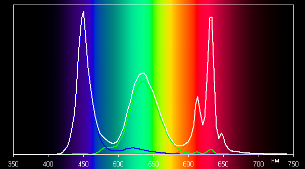 Спектры компонент достаточно хорошо разделены, что и обуславливает широкий цветовой охват. Для потребительского устройства широкий цветовой охват является недостатком, поскольку в итоге цвета изображений — рисунков, фотографий и фильмов, — ориентированных на пространство sRGB (а таких подавляющее большинство), имеют неестественную насыщенность. Особенно это заметно на узнаваемых оттенках, например на оттенках кожи. Результат приведен на фотографиях выше. Но в данном случае ситуацию частично спасает режим PureDisplay, пользователю остается только надеяться, что коррекция охвата будет выполнятся в используемых им программах и правильно.