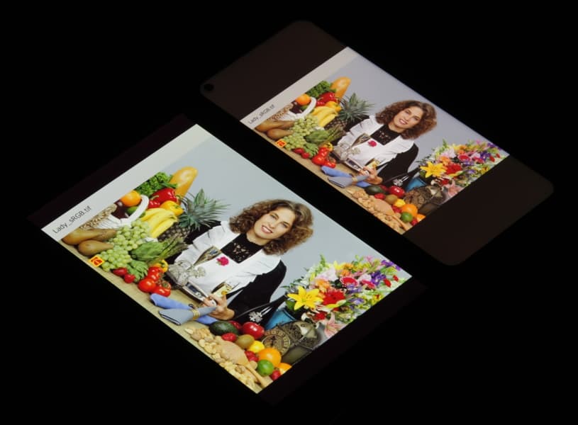 Экран имеет хорошие углы обзора без значительного сдвига цветов даже при больших отклонениях взгляда от перпендикуляра к экрану и без инвертирования оттенков. Для сравнения приведем фотографии, на которых на экраны Nokia 8.3 5G и Nexus 7 выведены одинаковые изображения, при этом яркость экранов изначально установлена примерно на 200 кд/м², а цветовой баланс на фотоаппарате принудительно переключен на 6500 К.