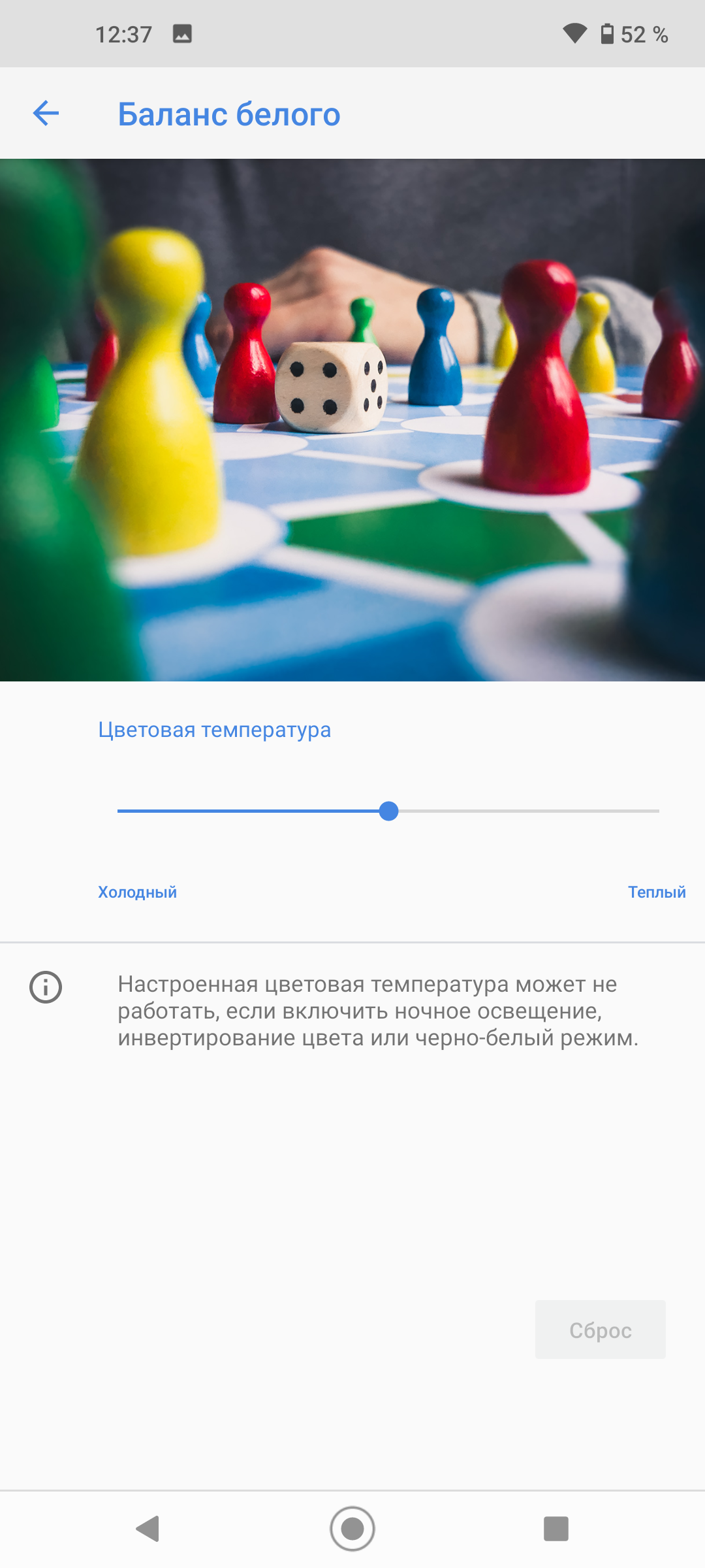 По умолчанию цветовая температура высоковата. Однако в этом устройстве есть возможность скорректировать цветовой баланс с помощью регулировки оттенка Холодный — Теплый .
