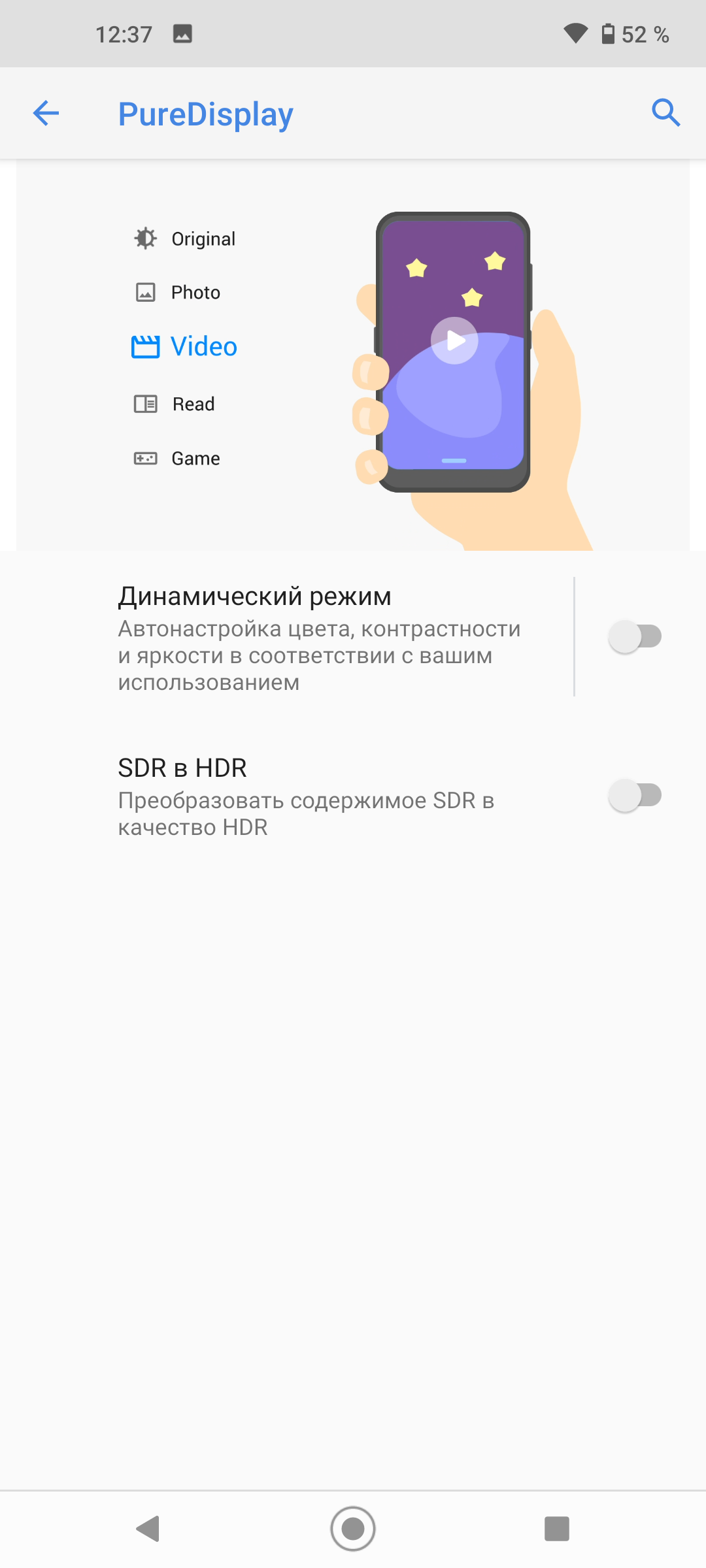 По критерию вывода кадров качество воспроизведения видеофайлов на экране самого смартфона очень хорошее, так как в большинстве случаев кадры (или группы кадров) могут (но не обязаны) выводиться с более-менее равномерным чередованием интервалов и без пропусков кадров. При воспроизведении видеофайлов с разрешением 1920 на 1080 пикселей (1080p) изображение собственно видеофайла выводится один-в-один по пикселям, точно по высоте экрана (при ландшафтной ориентации) и в истинном разрешении Full HD. Отображаемый на экране диапазон яркости соответствует стандартному диапазону 16—235: в тенях и в светах отображаются все градации оттенков. Отметим, что в этом смартфоне есть поддержка аппаратного декодирования файлов H.265 с глубиной цвета 10 бит на цвет, при этом вывод градиентов на экран осуществляется с лучшим качеством, чем в случае 8-битных файлов. Впрочем, это не доказательство истинного 10-битного вывода. Также поддерживается отображение файлов HDR (HDR10, H.265).