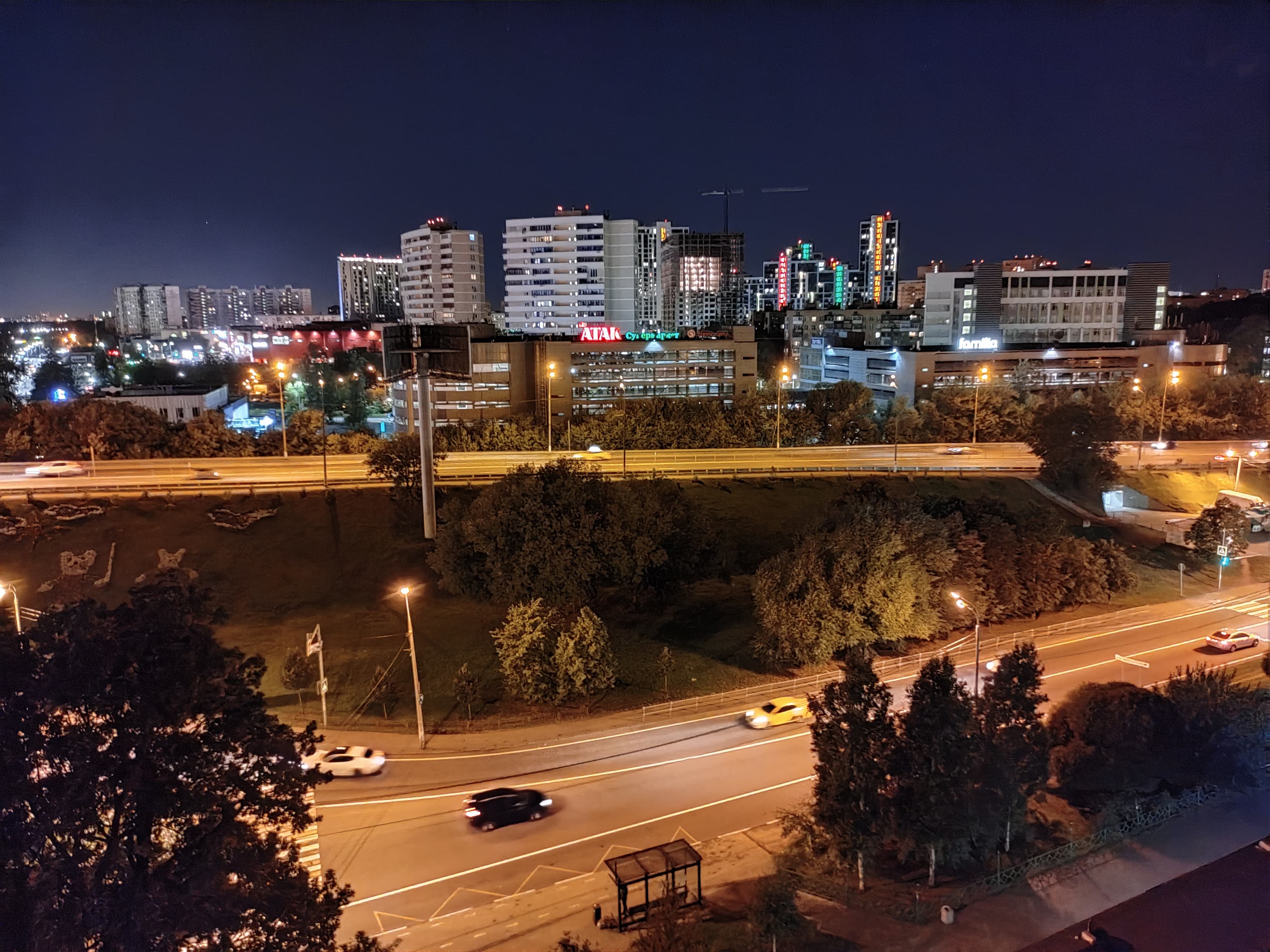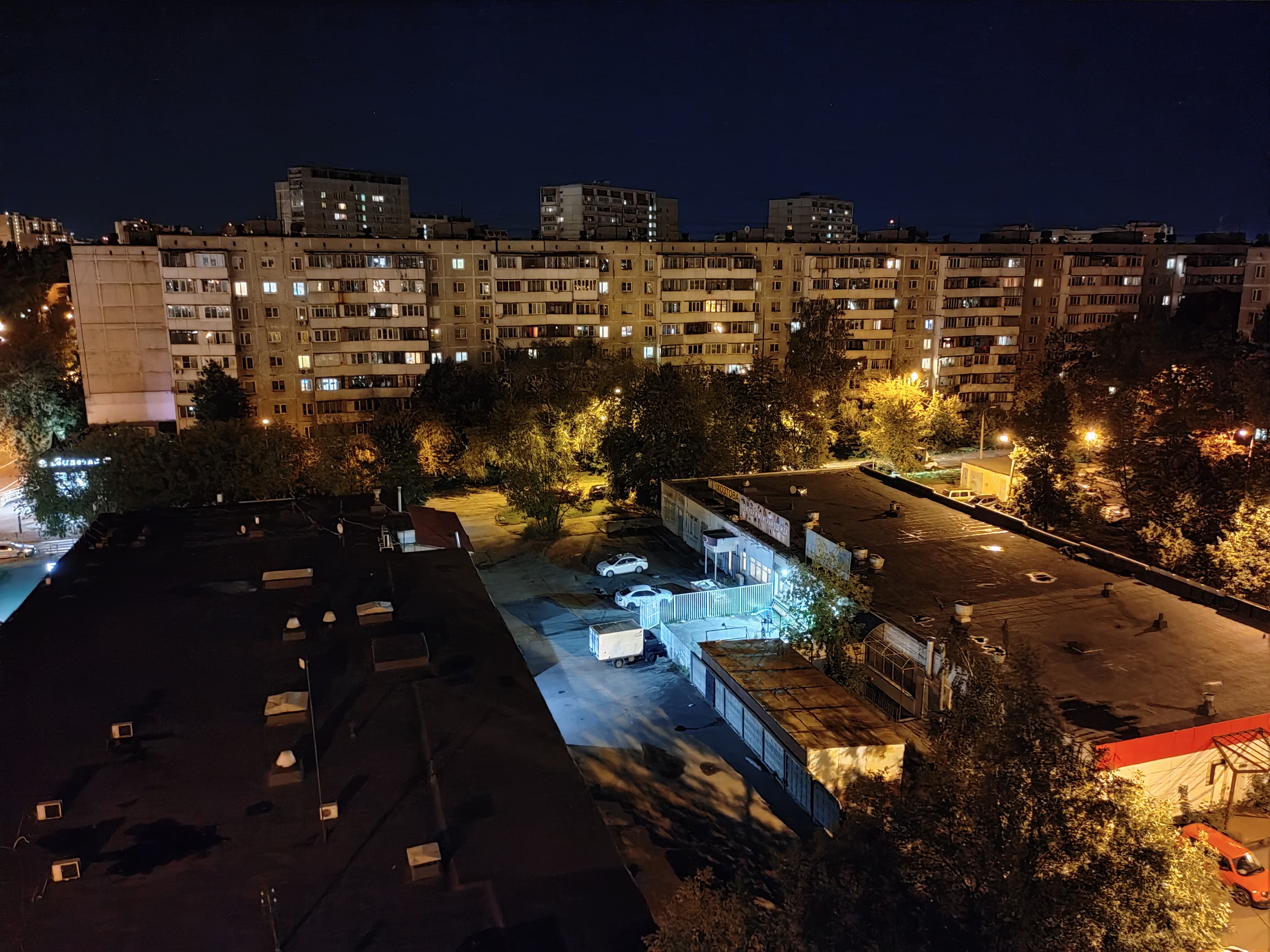 Отдельный ночной режим есть, и он доступен обеим основным камерам. Основной камере, надо заметить, он удается очень и очень недурно: мягкая работа с источниками света и почти полное отсутствие шумов, и все потому, что ИИ не пытается топорно задрать экспозицию, как это делает большинство китайских продуктов. Да, краски перенасыщены, но все равно картинка выглядит именно ночной, а не «ночью, как днем».