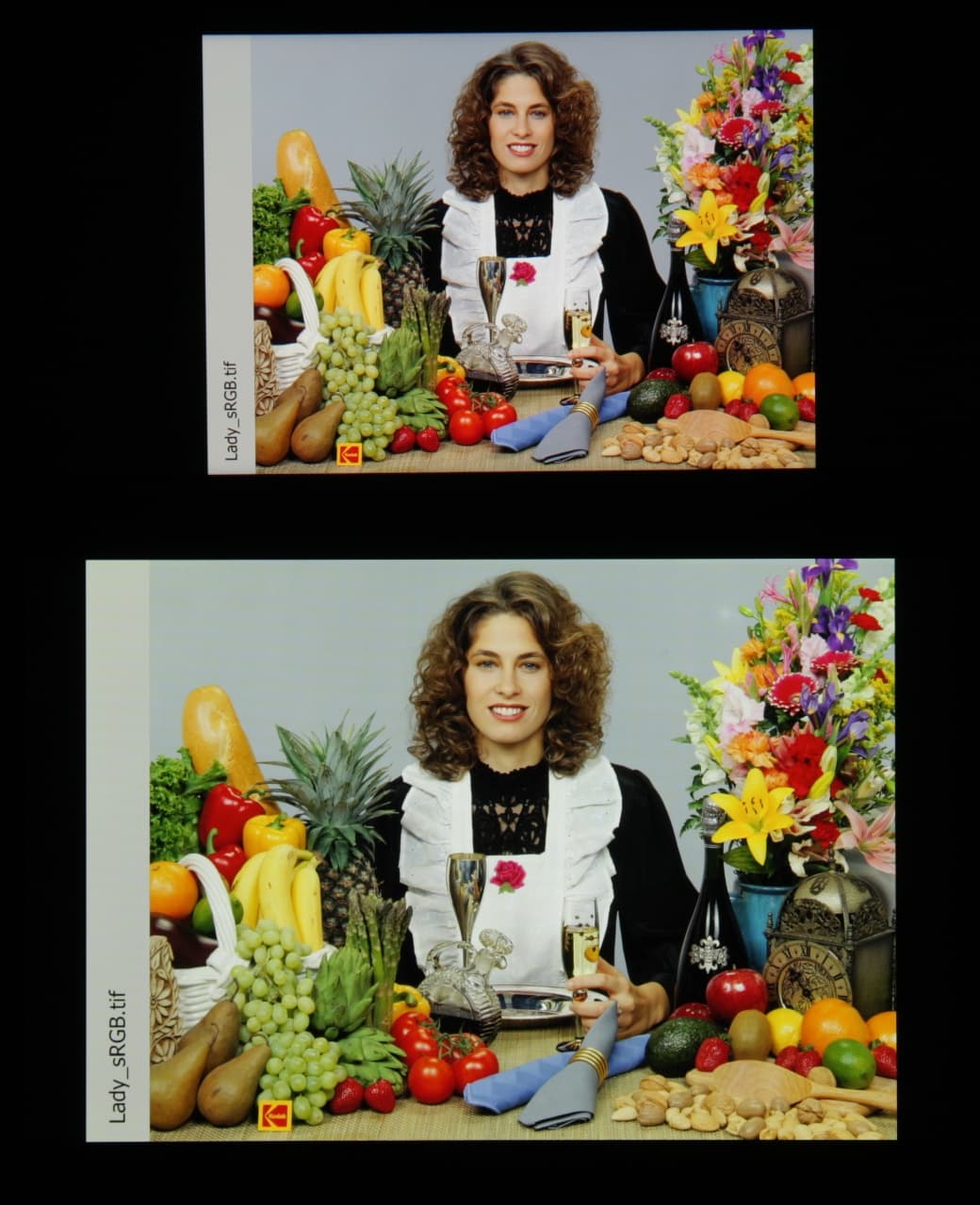 В частности при выводе тестовой картинки в программе Google Photos насыщенность цветов снижается до приемлемого уровня: