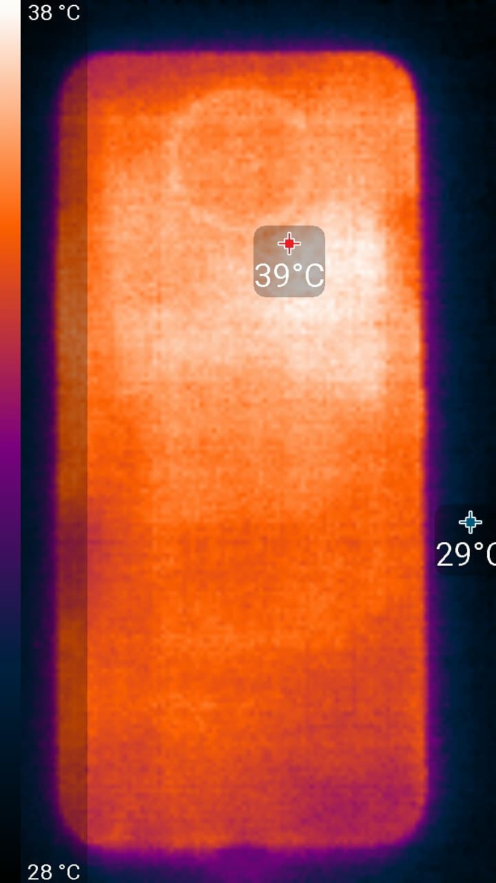 Нагрев больше в верхней левой части аппарата, что, видимо, соответствует расположению микросхемы SoC. По данным теплокамеры, максимальный нагрев составил 39 градусов (при температуре окружающего воздуха в 24 градуса), это средний нагрев для данного теста среди современных смартфонов.