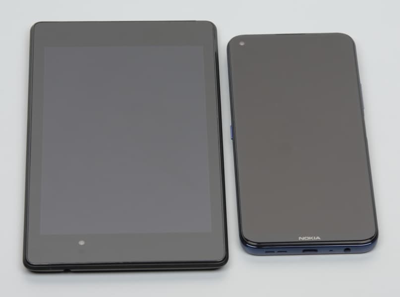 Лицевая поверхность экрана выполнена в виде стеклянной пластины с зеркально-гладкой поверхностью, устойчивой к появлению царапин. Судя по отражению объектов, антибликовые свойства экрана лучше, чем у экрана Google Nexus 7 (2013) (далее просто Nexus 7). Для наглядности приведем фотографию, на которой в выключенных экранах отражается белая поверхность (слева — Nexus 7, справа — Nokia 8.3 5G, далее их можно различать по размеру):