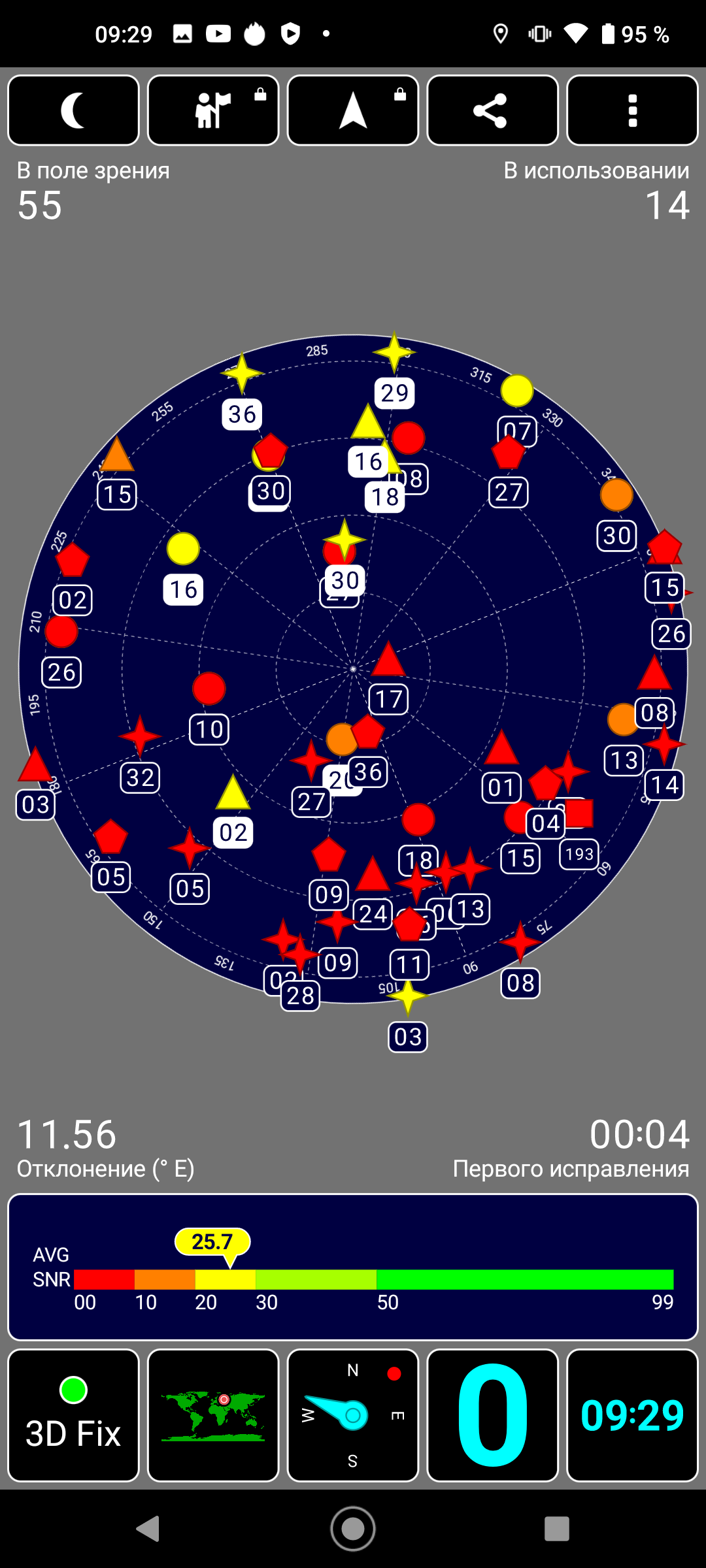 Навигационный модуль работает с GPS (с A-GPS, двухдиапазонный), с отечественной Глонасс, с китайской Beidou и с европейской Galileo. Первые спутники даже при холодном старте обнаруживаются быстро, точность позиционирования не вызывает претензий.