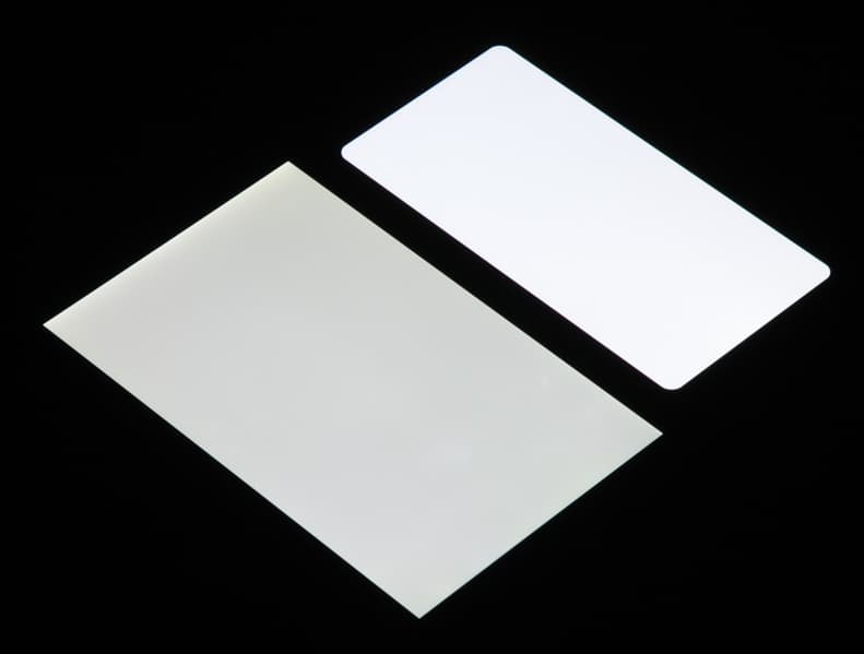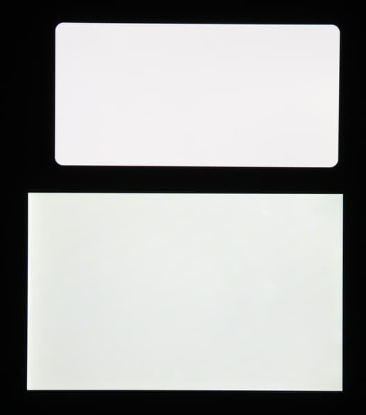 Экран характеризуется великолепными углами обзора. Правда, белый цвет при отклонении даже на небольшие углы приобретает едва заметный сине-зеленый оттенок, зато черный цвет остается просто черным под любыми углами. Он настолько черный, что параметр контрастности в данном случае неприменим. Для сравнения приведем фотографии, на которых на экраны Nokia 9 Pureview (профиль Стандартные [цвета]) и второго участника сравнения выведены одинаковые изображения, при этом яркость экранов изначально установлена примерно на 200 кд/м², а цветовой баланс на фотоаппарате принудительно переключен на 6500 К.