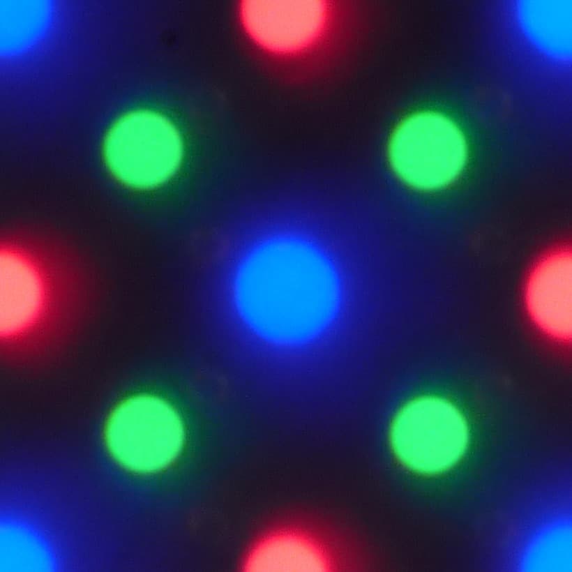 В этом экране используется матрица AMOLED — активная матрица на органических светодиодах. Полноцветное изображение создается с помощью субпикселей трех цветов — красного (R), зеленого (G) и синего (B), но красных и синих субпикселей в два раза меньше, что можно обозначить как RGBG. Это подтверждается фрагментом микрофотографии: