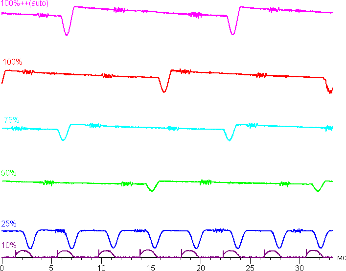Только на низком уровне яркости появляется значимая модуляция с частотой 240 Гц. На рисунке ниже приведены зависимости яркости (вертикальная ось) от времени (горизонтальная ось) для нескольких значений настройки яркости (100%++(auto) — это в автоматическом режиме и с дополнительной засветкой датчика освещенности ярким светом):