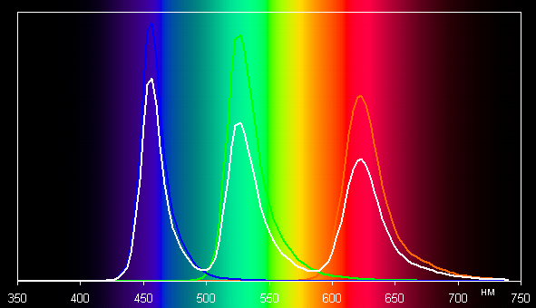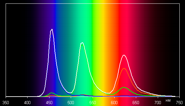 В случае профиля Стандартные [цвета] баланс оттенков на шкале серого хороший, так как цветовая температура не сильно выше стандартных 6500 К, и отклонение от спектра абсолютно черного тела (ΔE) ниже 10 единиц, что для потребительского устройства считается хорошим показателем. При этом вариация цветовой температуры не очень большая — это положительно сказывается на визуальной оценке цветового баланса. (Темные области шкалы серого можно не учитывать, так как там баланс цветов не имеет большого значения, да и погрешность измерений цветовых характеристик на низкой яркости большая.)
