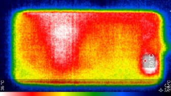 Нагрев локализован в двух областях: вверху, где, видимо, расположена микросхема SoC, и внизу, где, скорее всего, находится контроллер зарядки. Относительно высокий нагрев второго косвенно свидетельствует о его низкой эффективности (смартфон в ходе теста был подключен к зарядному устройству). По данным теплокамеры, максимальный нагрев в области SoC меньше 36 градусов (при температуре окружающего воздуха в 24 градуса), это немного.