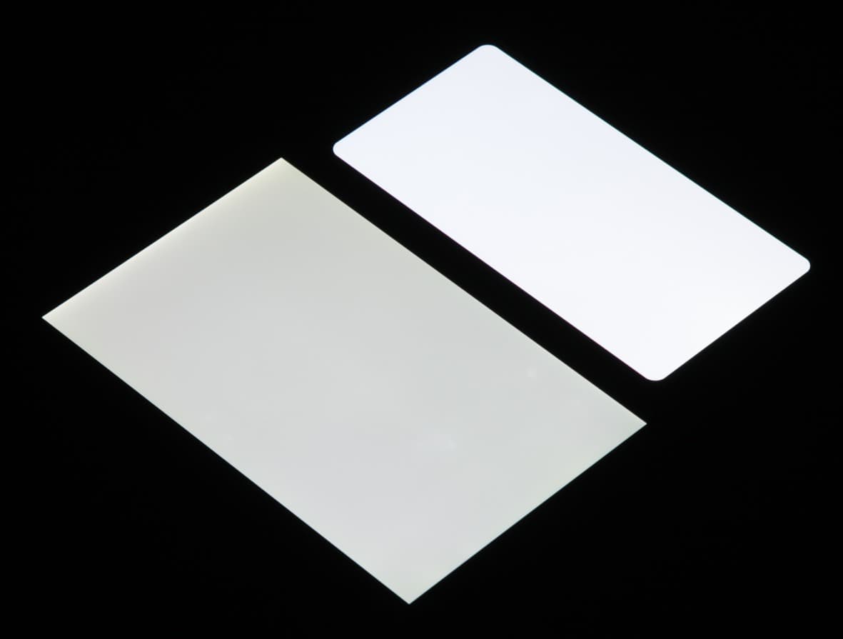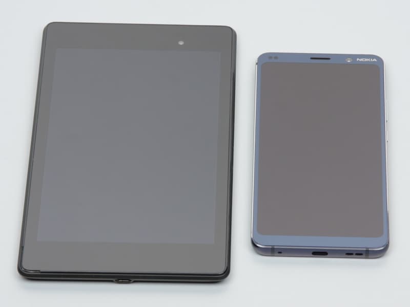 Лицевая поверхность экрана выполнена в виде стеклянной пластины с зеркально-гладкой поверхностью, устойчивой к появлению царапин. Судя по отражению объектов, антибликовые свойства экрана лучше, чем у экрана Google Nexus 7 (2013) (далее просто Nexus 7). Для наглядности приведем фотографию, на которой в выключенных экранах отражается белая поверхность (слева — Nexus 7, справа — Nokia 9 Pureview, далее их можно различать по размеру):