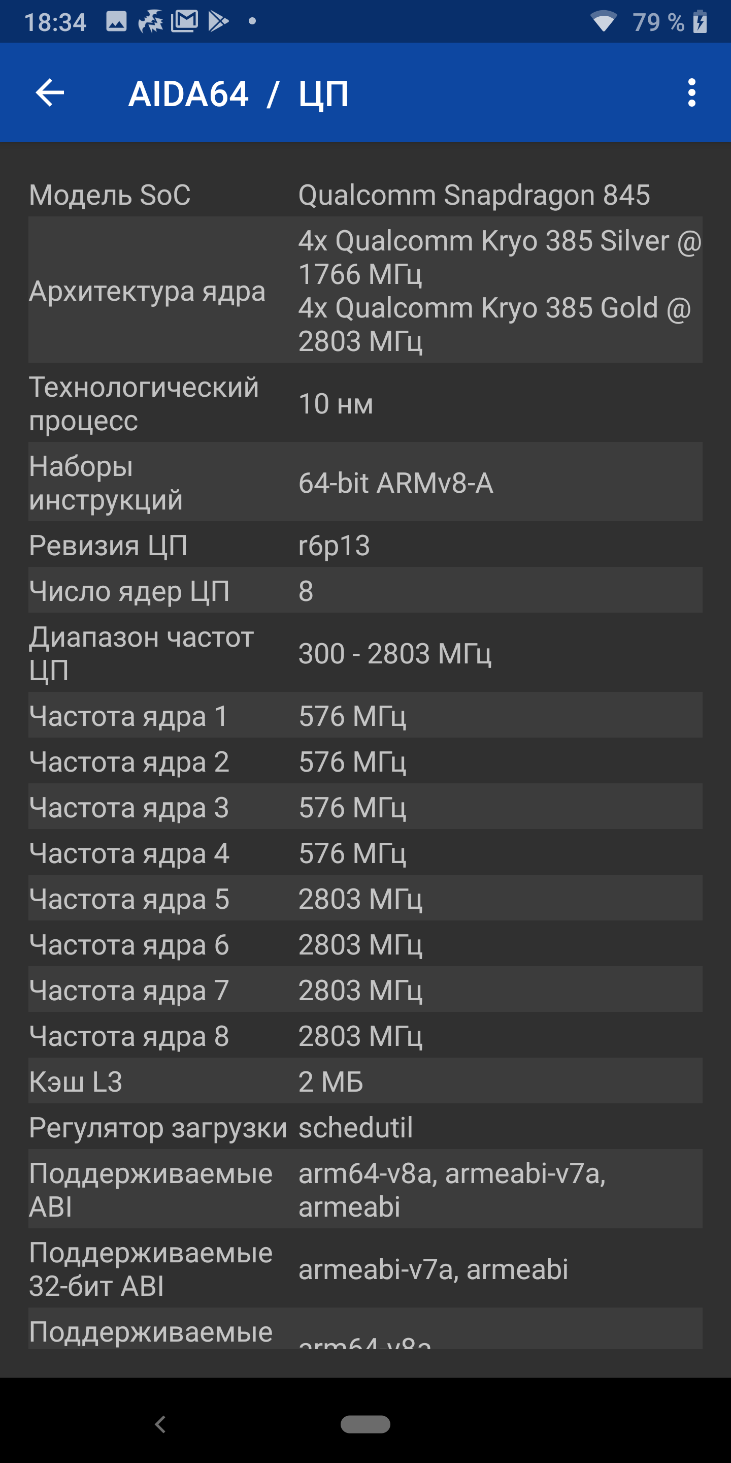 - SoC Qualcomm Snapdragon 845, 8 ядер (4 × Kryo 385 Gold @2,96 ГГц + 4 × Kryo 385 Silver @1,8 ГГц)