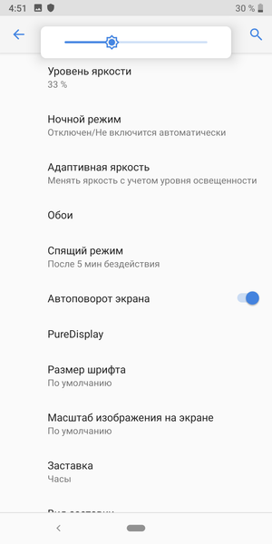 При выводе белого поля во весь экран и при ручном управлении яркостью ее максимальное значение составило 470 кд/м² в обычных условиях, на очень ярком свету оно повышается до 495 кд/м². В данном случае чем меньше площадь белого на экране, тем он светлее, то есть фактическая максимальная яркость белых участков будет почти всегда выше указанных значений. В итоге читаемость экрана днем на солнце должна быть на хорошем уровне. Минимальное значение яркости — 2,1 кд/м², то есть пониженный уровень яркости без проблем позволяет использовать устройство даже в полной темноте. Работает автоматическая регулировка яркости по датчику освещенности (он расположен в левом верхнем углу на фронтальной панели). Работа этой функции зависит от положения ползунка регулировки яркости: им пользователь может попытаться выставить желаемый уровень яркости в текущих условиях. Если оставить все по умолчанию, то в полной темноте функция автояркости уменьшает яркость до 5 кд/м² (чуть темновато), в условиях освещенного искусственным светом офиса (примерно 550 лк) устанавливает на 100 кд/м² (нормально), в очень ярком окружении (условно соответствует нахождению на прямом солнечном свету) повышает до 620 кд/м² (что даже больше, чем при ручной регулировке). Результат нас не совсем устроил, поэтому мы в полной темноте чуть увеличили яркость, получив в итоге для трех условий, указанных выше, следующие значения: 10, 115, 620 кд/м² (отлично). Получается, что функция автоподстройки яркости работает адекватно и позволяет настраивать свою работу под индивидуальные требования.