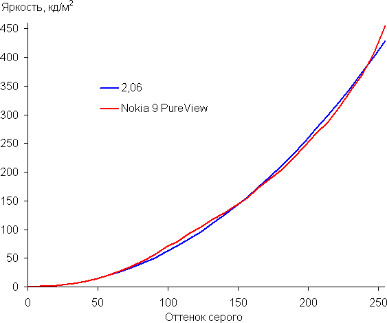 Напомним, что в случае OLED-экранов яркость фрагментов изображения динамично меняется в соответствии с характером выводимого изображения — немного уменьшается для светлых в целом изображений. В итоге полученная зависимость яркости от оттенка (гамма-кривая), скорее всего, не соответствует гамма-кривой статичного изображения, так как измерения проводились при последовательном выводе оттенков серого почти на весь экран.
