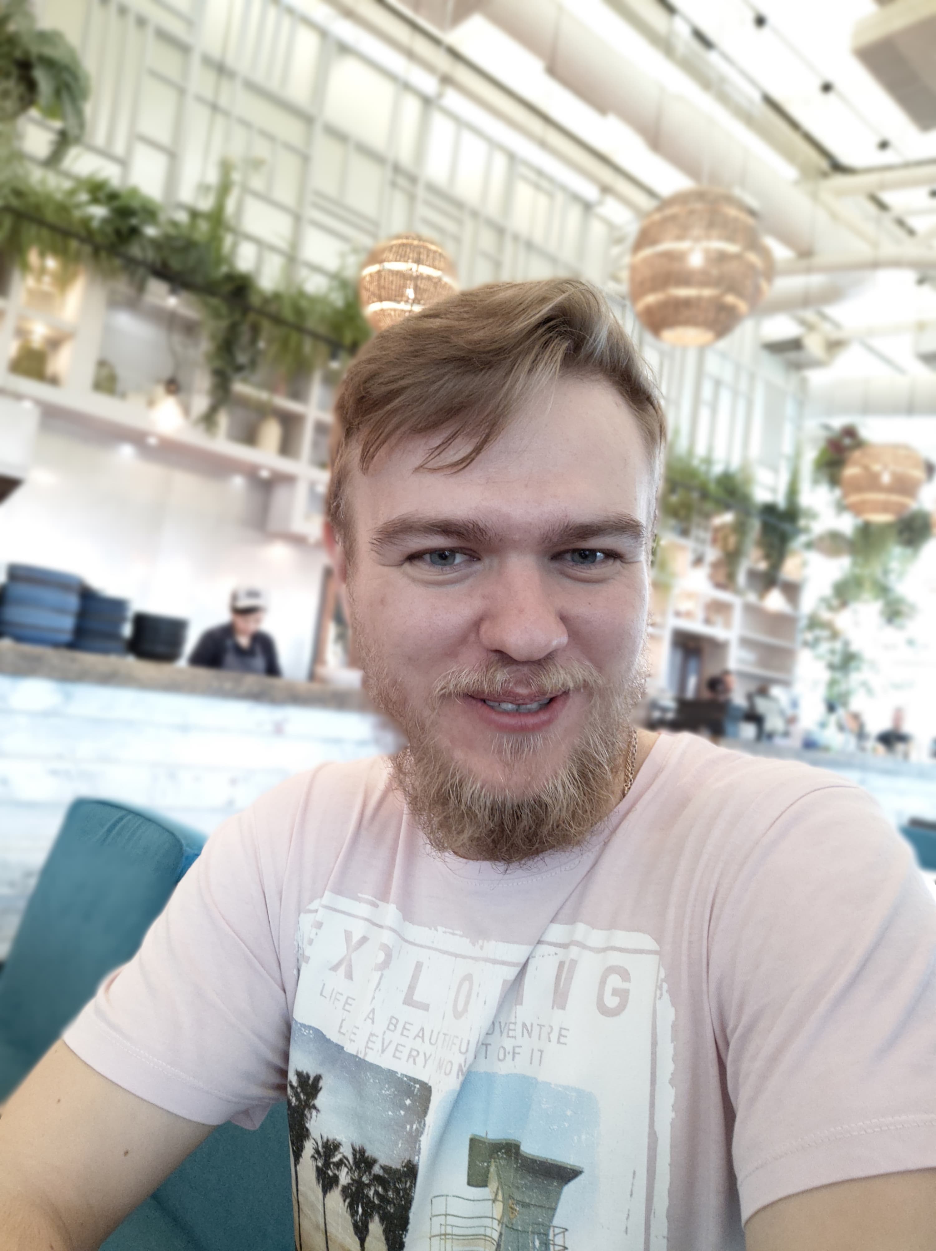 Фронтальная камера Nokia 9 Pureview снимает с хорошей (особенно для 20 Мп) детализацией, но в портретном режиме при комнатном освещении не очень чисто обрезает объект съемки, да и динамический диапазон оставляет желать лучшего.