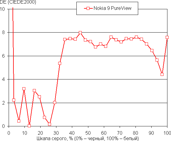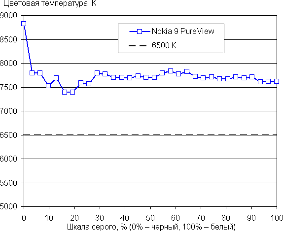 Цветопередача хорошая, цвета в меру насыщенные, цветовой баланс у экранов немного различается. Напомним, что фотография не может служить надежным источником сведений о качестве цветопередачи и приводится только для условной наглядной иллюстрации. В частности, выраженный красноватый оттенок белого и серого полей, присутствующий на фотографиях экрана Nokia 9 Pureview, при перпендикулярном взгляде визуально отсутствует, что подтверждается аппаратными тестами с помощью спектрофотометра. Причина в том, что спектральная чувствительность матрицы фотоаппарата неточно совпадает с этой характеристикой человеческого зрения.