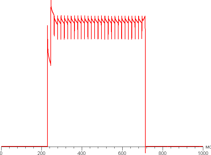 Переключение состояния элементов матрицы выполняется практически мгновенно, но на фронте включения может присутствовать ступенька шириной примерно 17 мс (что соответствует частоте обновления экрана в 60 Гц). Например, так выглядит зависимость яркости от времени при переходе от черного к белому и обратно:
