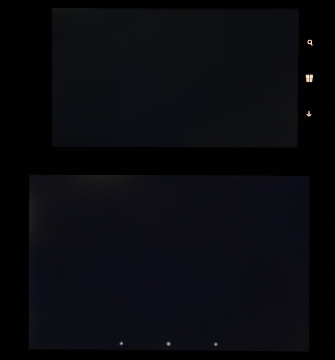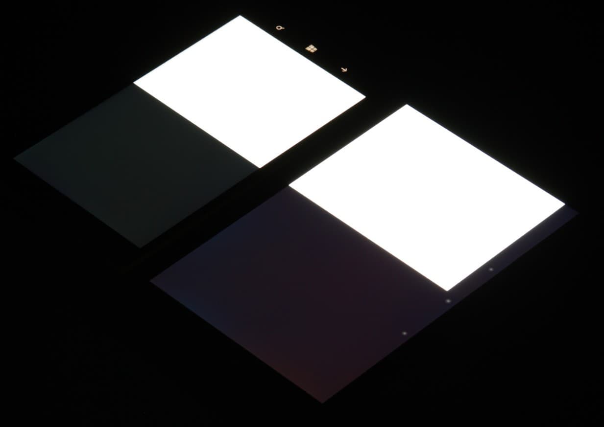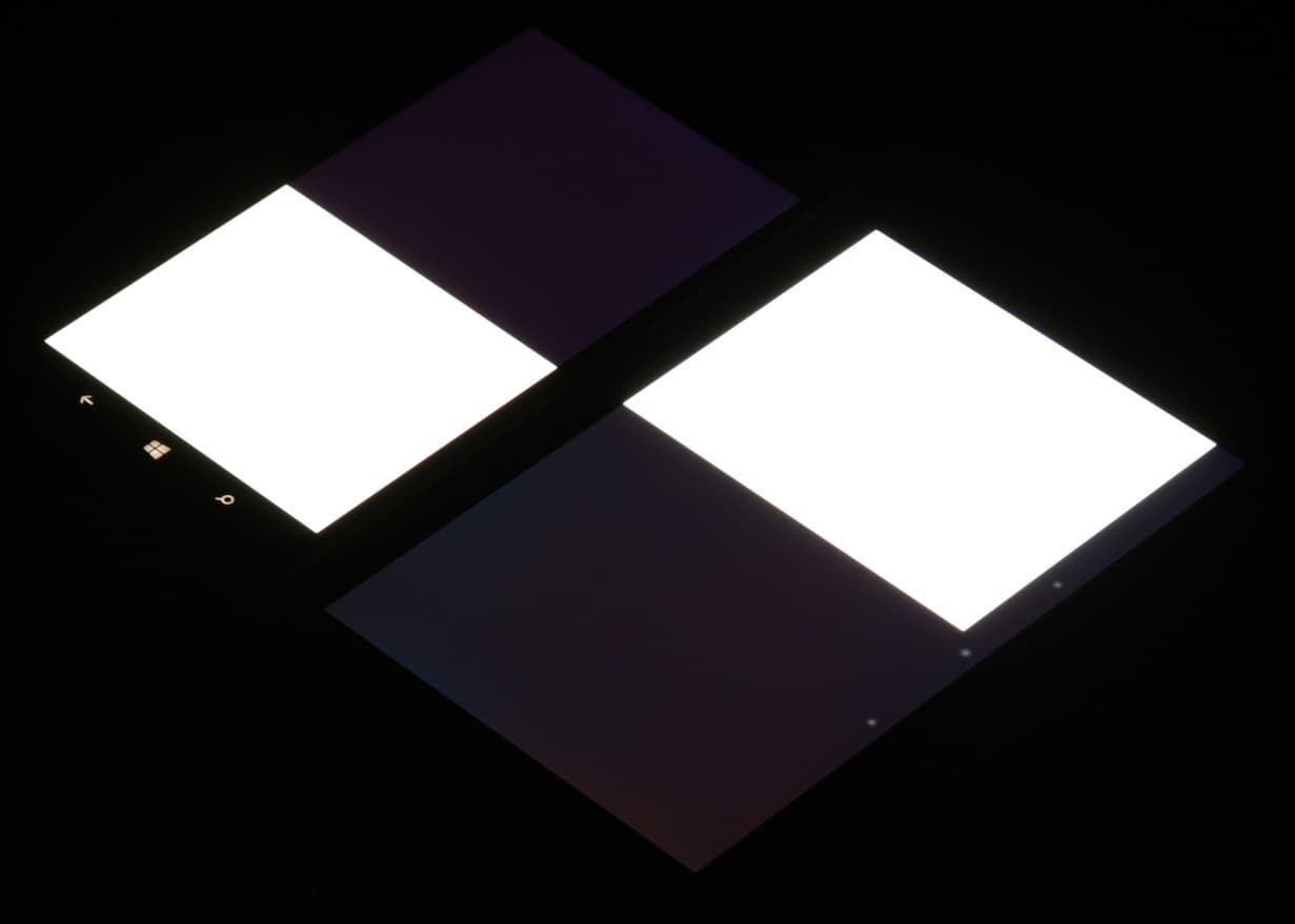Яркость под углом у обоих экранов заметно уменьшилась (более чем в 4 раза, исходя из разницы в выдержке), но в случае Lumia 1520 падение яркости больше. При этом цветовой тон у обоих экранов изменился несильно. Черное поле при отклонении по диагонали высветляется совсем немного и приобретает красно-фиолетовый оттенок или остается почти нейтрально серым. Фотография с Nexus 7 для сравнения это показывает (яркость белых участков, измеренная в перпендикулярном плоскости экранов направлении, у обоих экранов одинаковая!):