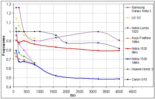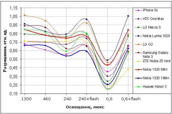 Большого смысла в снимках 20 Мп нет, так как по разрешению они практически такие же, как и 5 Мп. Но иметь под рукой подобный «сырой» снимок порой удобно — хотя детализация на нем не лучше, разглядеть детали проще. Однако, как видно из графика, по результатам съемки миры режимы различаются в пользу 5 Мп, что вполне логично, так как одним из результатов обработки должно являться улучшение резкости. Камера несколько уступает Nokia 1020: видимо, сказывается не столько меньшее разрешение, сколько смена объектива.