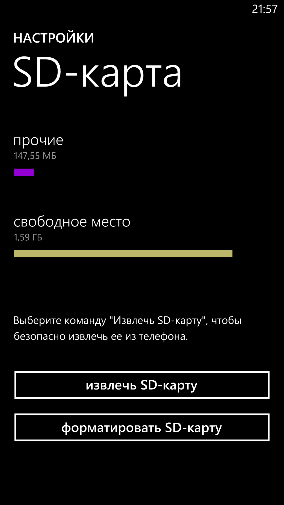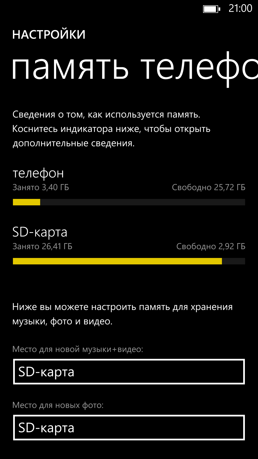 Объем оперативной памяти в смартфоне составляет 2 ГБ. Предусмотрено 32 ГБ встроенной флэш-памяти (на новом аппарате пользователю из них доступно около 28 ГБ) и слот для установки карт памяти microSD объемом до 64 ГБ (мы проверяли работу только с картами на 32 ГБ). Учитывая качественную камеру и располагающий к просмотру высококачественного видео экран, за такое сочетание производителя можно похвалить. Как обычно, доступ к памяти возможен через интерфейс USB 2.0 по протоколу MTP. Упомянем возможность использования 7 ГБ в облачном хранилище SkyDrive.