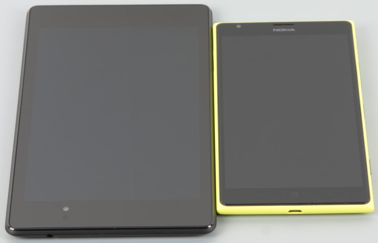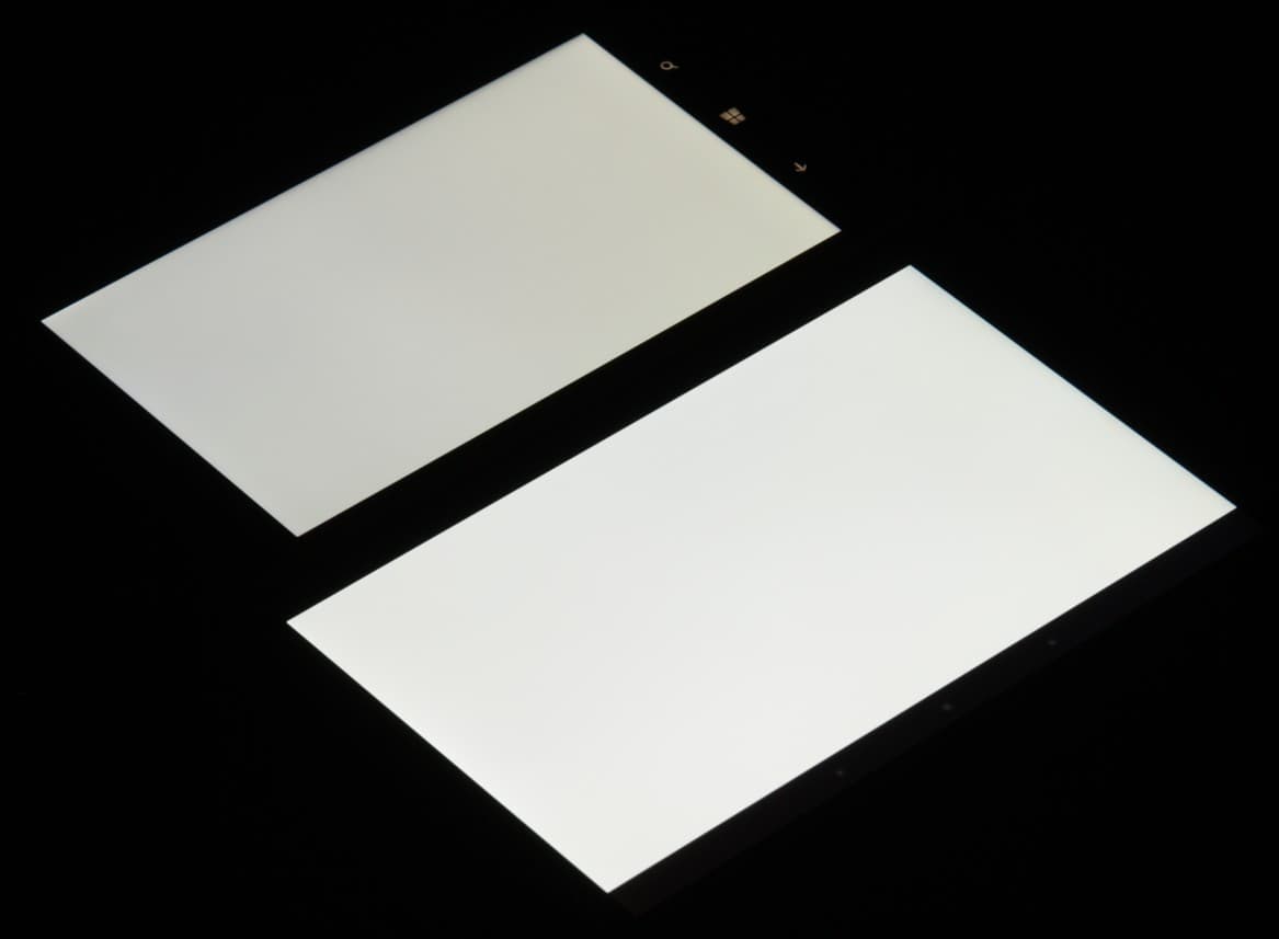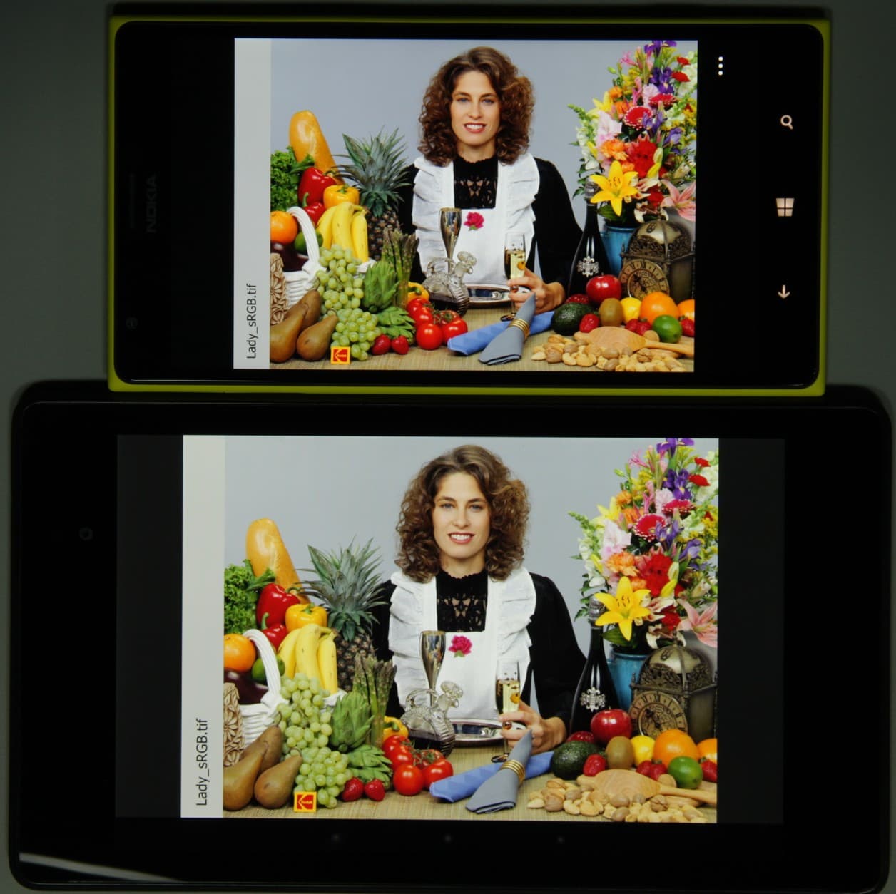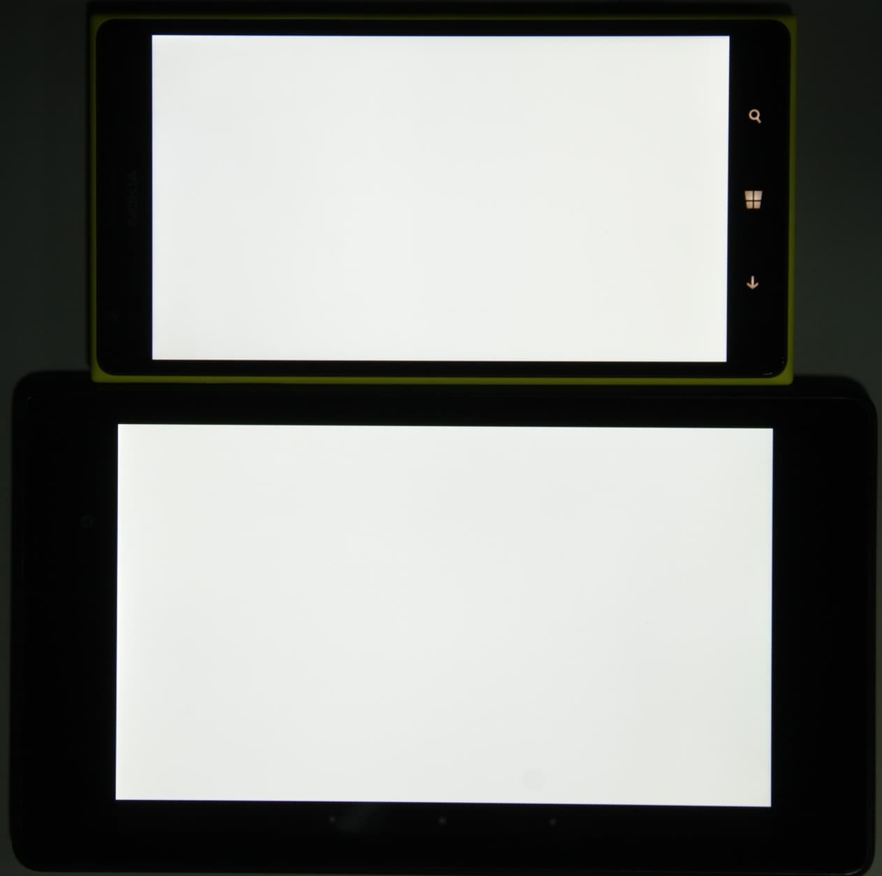 Экран имеет хорошие углы обзора без инвертирования оттенков и без значительного сдвига цветов даже при больших (в пределах разумного) отклонениях взгляда от перпендикуляра к экрану. Для сравнения приведем фотографии, на которых на экраны Nexus 7 и Lumia 1520 выведены одинаковые изображения, при этом яркость обоих экранов установлена примерно на 175 кд/м². Перпендикулярно к экранам белое поле: