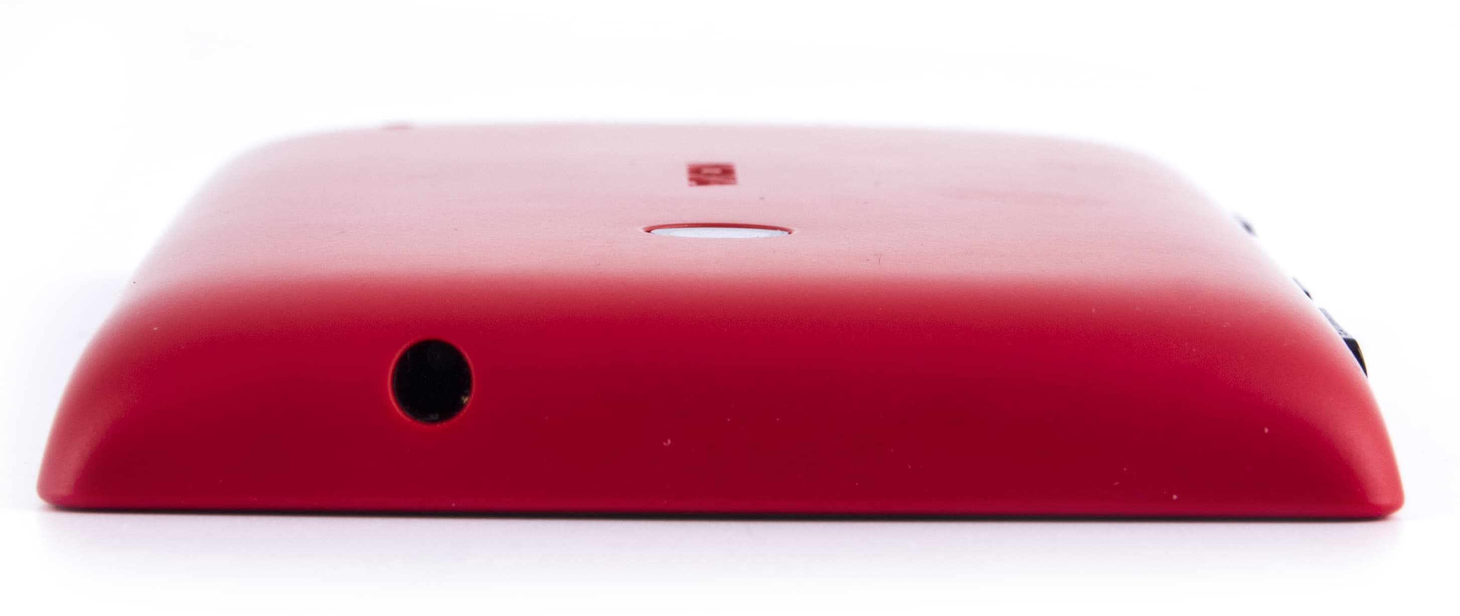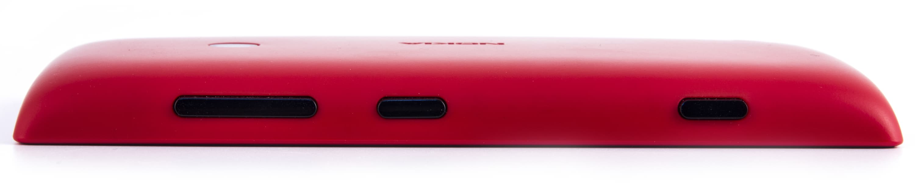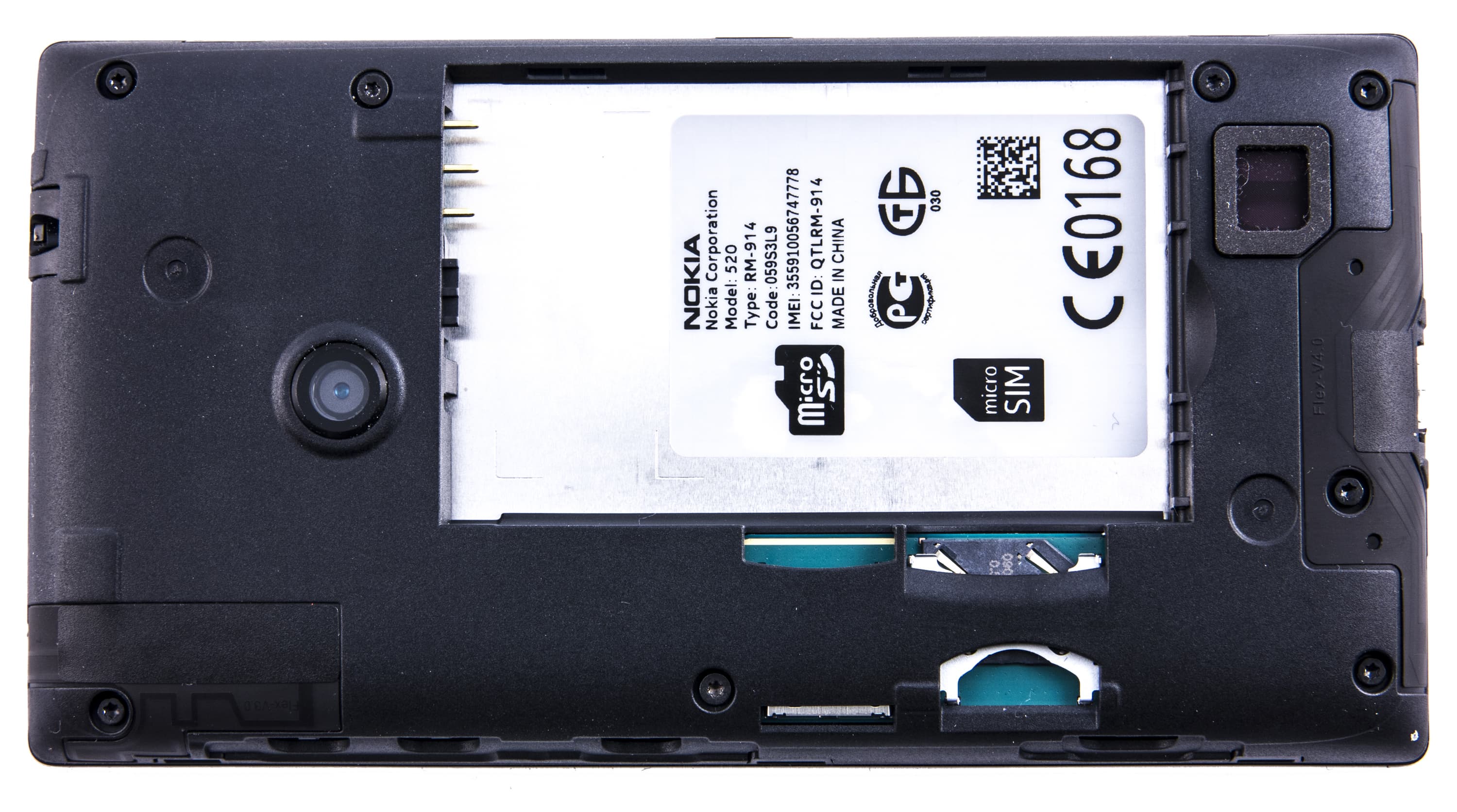 Для всех разъемов, основного динамика и объектива камеры в крышке аккумуляторного отсека предусмотрены технологические отверстия. Аппаратные клавиши представлены в виде пластиковых повторителей, прикрепленных к ней же. Какая-либо защита для объектива камеры отсутствует, но сам он немного углублен относительно уровня задней панели — так что, в отличие от многих других смартфонов, Nokia Lumia 520 не опирается на него, когда лежит «на спине».