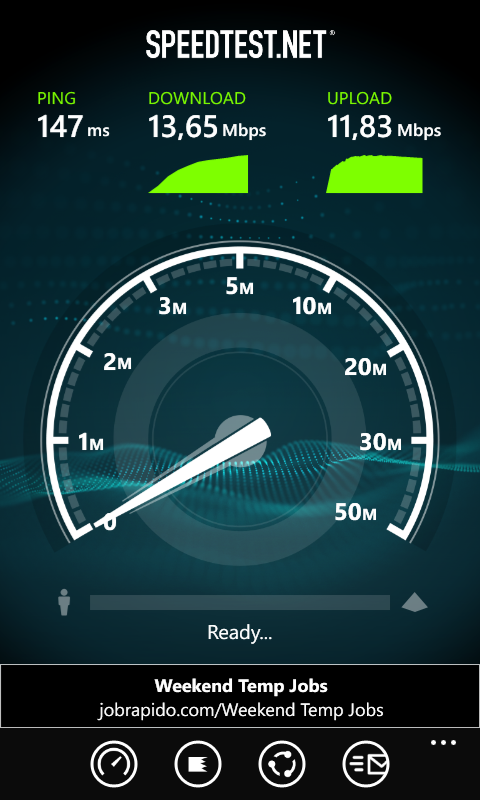 Подключение к домашней сети 802.11n с роутером TP-Link TL-WR1043N в качестве базовой станции также прошло без эксцессов. Скорость соединения с сетью в этом случае была ограничена лишь пропускной способностью канала связи с провайдером. По субъективным впечатлениям, качество приема сигнала Wi-Fi у Nokia Lumia 520 лучше, чем у многих других коммуникаторов. Так, герой обзора успешно обнаруживал сеть и подключался к ней там, где Samsung Galaxy S2 не находил ничего.