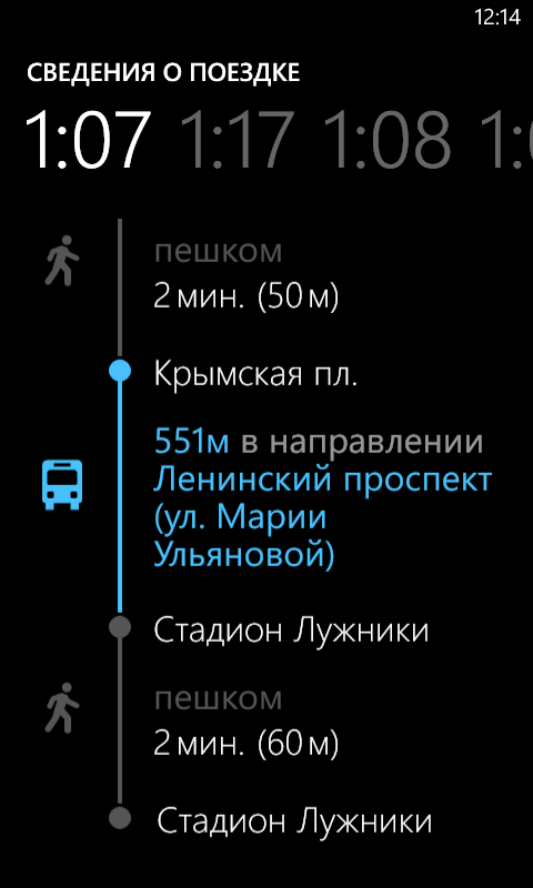 HERE Transit позволяет прокладывать маршруты на основании базы данных об общественном транспорте. Причем программа предлагает сразу несколько вариантов и вы можете выбрать подходящий. Программы этой серии связаны между собой, используют одни карты, списки избранного и другие данные. Кроме того, в некоторых ситуациях могут запускать друг друга с передачей информации о маршруте. С точки зрения производительности на рассматриваемом телефоне навигация работает достаточно неплохо, хотя и не так плавно, как на других платформах.