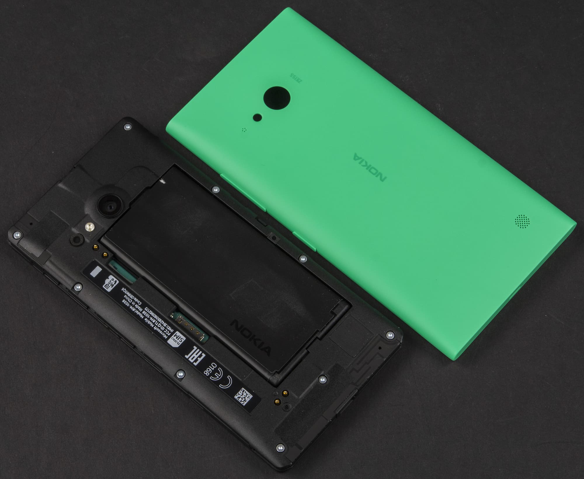 Внешний и внутренний корпуса разъединяются очень трудно, но с этой проблемой сталкиваешься только при замене карты памяти или SIM-карты. Если в случае Nokia Lumia 520, чья конструкция схожа с рассматриваемым смартфоном, для отсоединения крышки достаточно слегка надавить на объектив основной камеры, то у Nokia Lumia 730 приходится давить на него «что есть силы», при этом еще и прихватывая показавшийся внутренний корпус. Все дело в том, что крышка и внутренний корпус крепятся множеством защелок, которые, тем не менее, не избавили конструкцию от люфта. В итоге складывается впечатление, что в верхней части крышки с внутренней стороны не хватает наклейки-демпфера, а сама конструкция не переживет большое количество рассоединений.