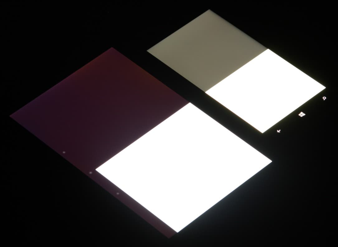 Экран имеет хорошие углы обзора без значительного сдвига цветов даже при больших отклонениях взгляда от перпендикуляра к экрану и без инвертирования (кроме самых-самых темных при отклонении взгляда влево) оттенков. Для сравнения приведем фотографии, на которой на экраны Nexus 7 и Nokia Lumia 830 выведены одинаковые изображения, при этом яркость экранов изначально установлена примерно на 200 кд/м² (по белому полю во весь экран), а цветовой баланс на фотоаппарате принудительно переключен на 6500 К. Перпендикулярно к плоскости экранов белое поле: