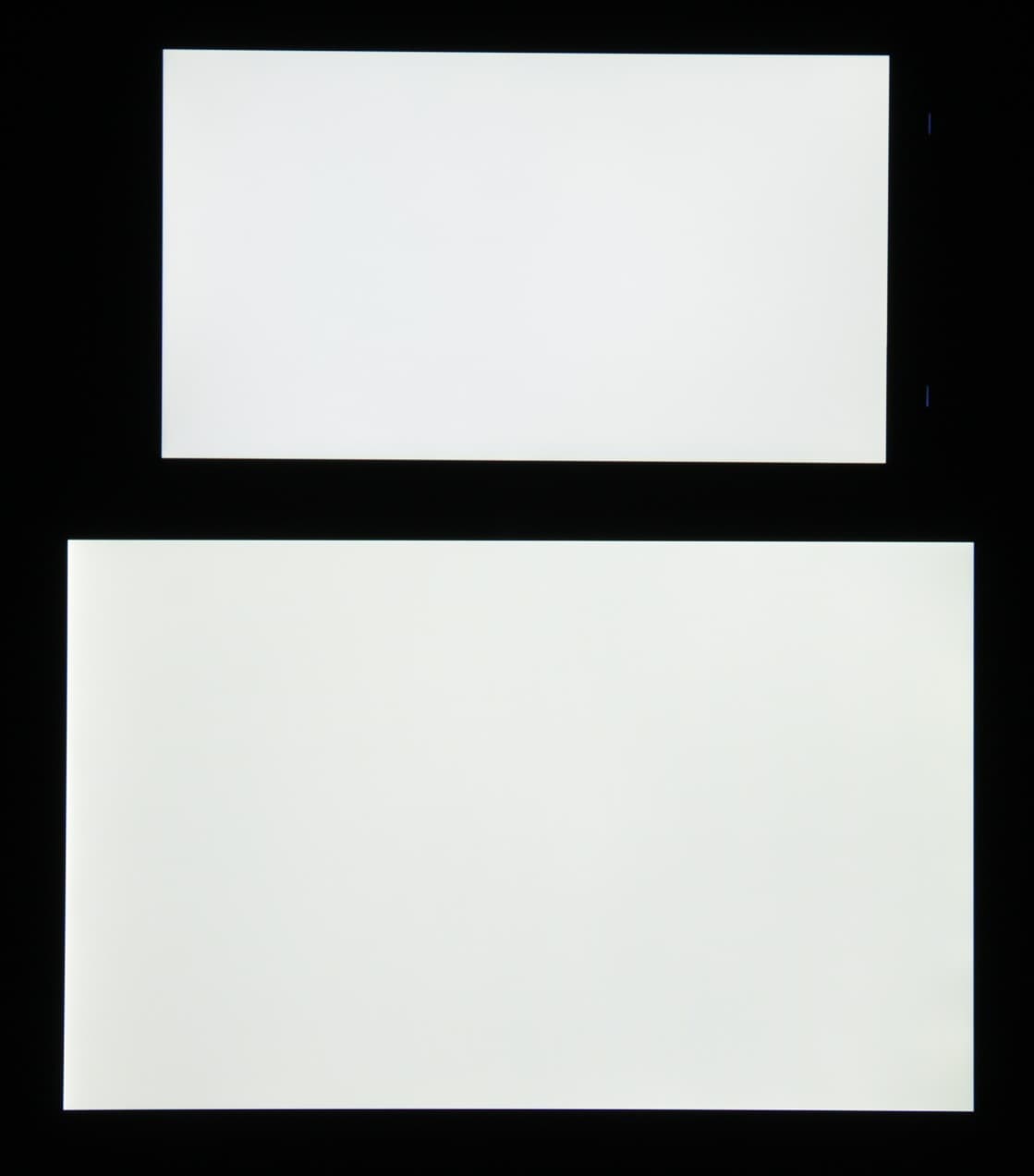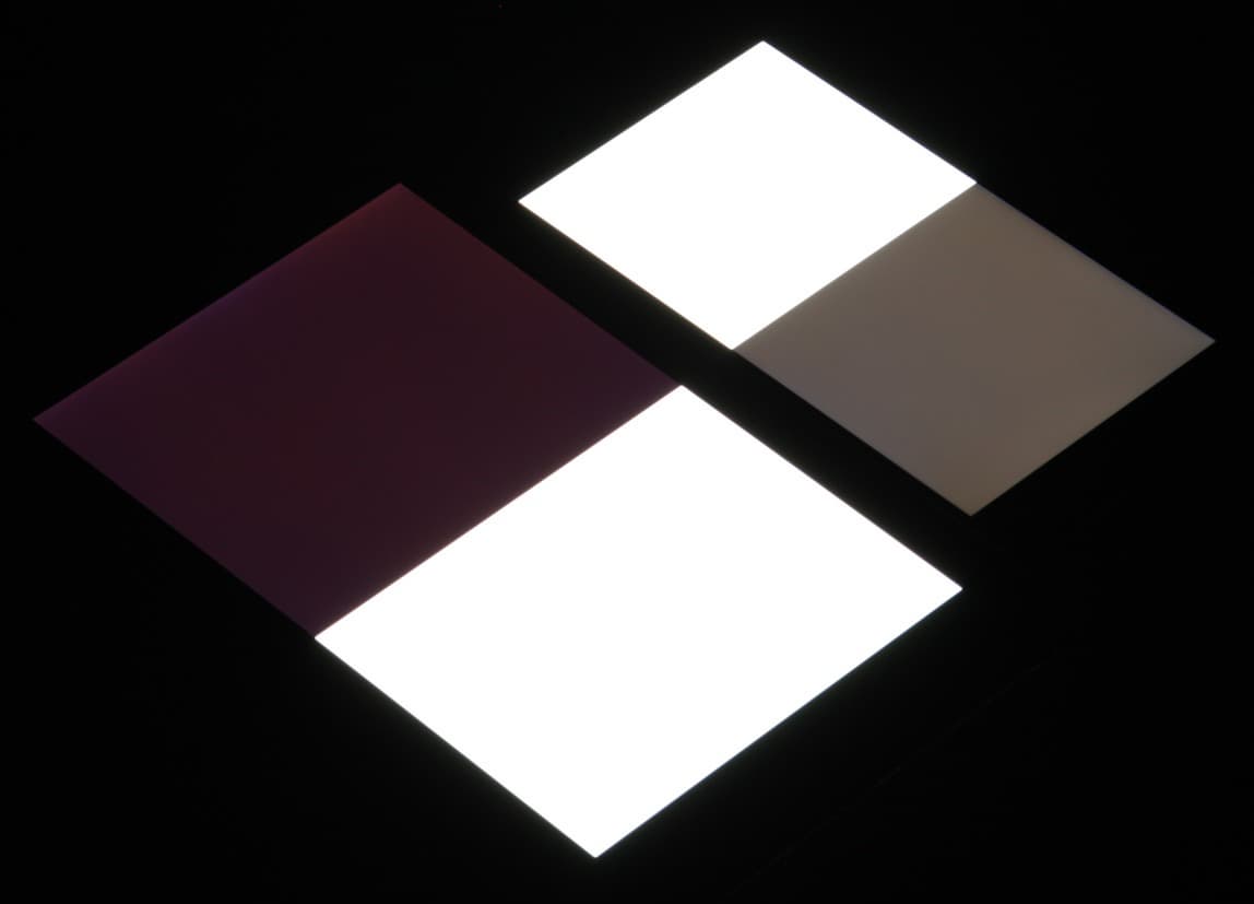 Яркость под углом у экранов уменьшилась, но у OnePlus 2 экран под этим углом все же светлее. Черное поле при отклонении по диагонали высветляется сильно и приобретает легкий красно-фиолетовый оттенок. Фотографии ниже это демонстрируют (яркость белых участков в перпендикулярном плоскости экранов направлении одинаковая!):
