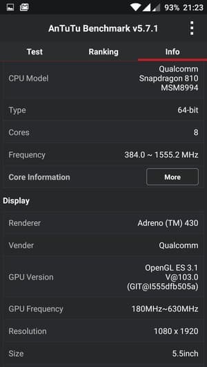 - SoC Qualcomm Snapdragon 810, 1,8 + 1,5 ГГц, 4×2 ядер, ARM Cortex-A57 + Cortex-A53
