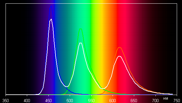 Без коррекции (профиль По умолчанию) спектры компонент (то есть спектры чистых красного, зеленого и синего цветов) очень хорошо разделены:
