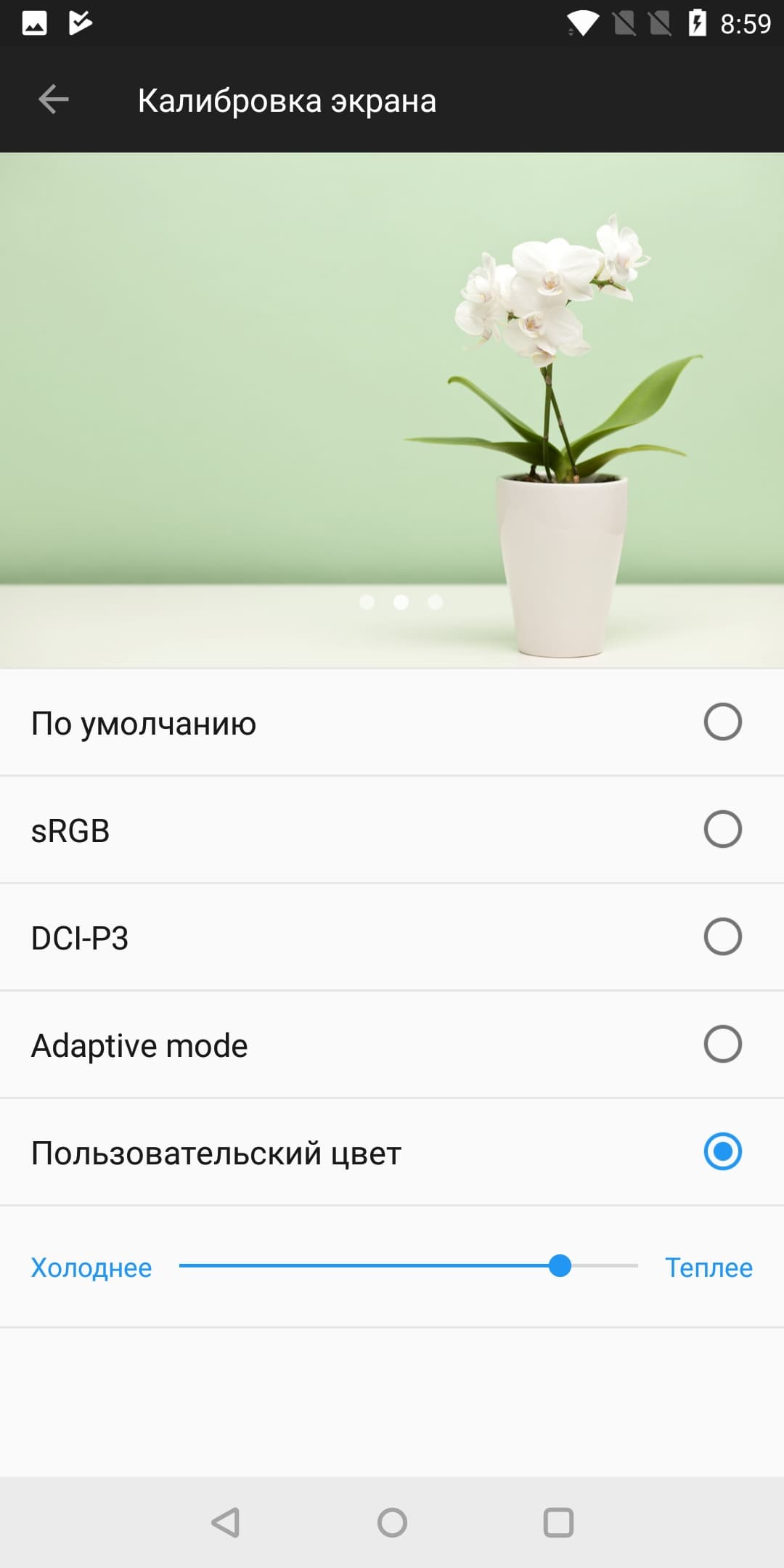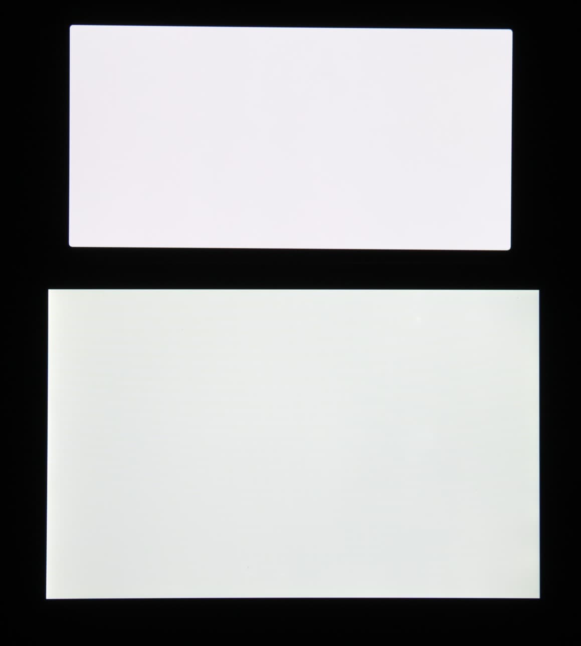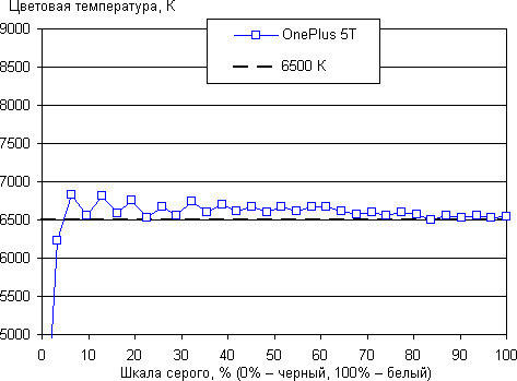 Экран характеризуется великолепными углами обзора. Правда, белый цвет при отклонении даже на небольшие углы приобретает легкий сине-зеленый оттенок, а под некоторыми углами чуть-чуть розовеет, но черный цвет остается просто черным под любыми углами. Он настолько черный, что параметр контрастности в данном случае просто неприменим. Для сравнения приведем фотографии, на которых на экраны OnePlus 5T и второго участника выведены одинаковые изображения, при этом яркость экранов изначально установлена примерно на 200 кд/м², а цветовой баланс на фотоаппарате принудительно переключен на 6500 К.