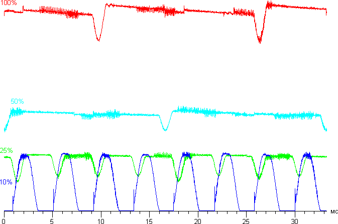 Только на низком уровне яркости присутствует значимая модуляция с частотой 240 Гц. На рисунке ниже приведены зависимости яркости (вертикальная ось) от времени (горизонтальная ось) для нескольких значений яркости: