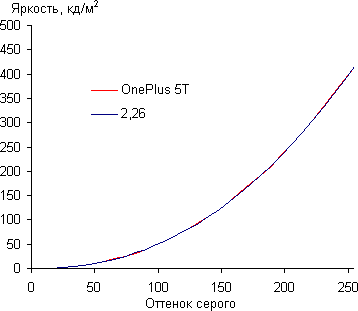Построенная по 32 точкам с равным интервалом по численному значению оттенка серого гамма-кривая не выявила завала ни в тенях, ни в светах. Показатель аппроксимирующей степенной функции равен 2,26, что немного больше стандартного значения 2,2, при этом реальная гамма-кривая практически совпадает со степенной зависимостью: