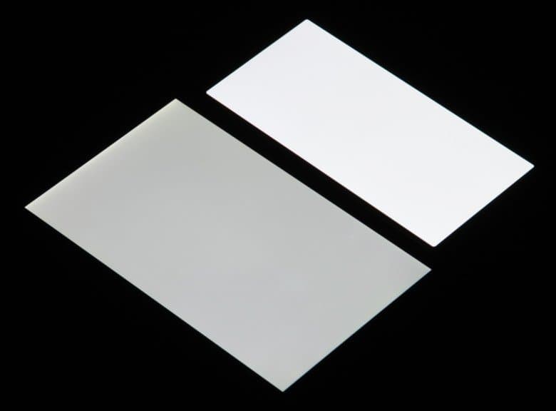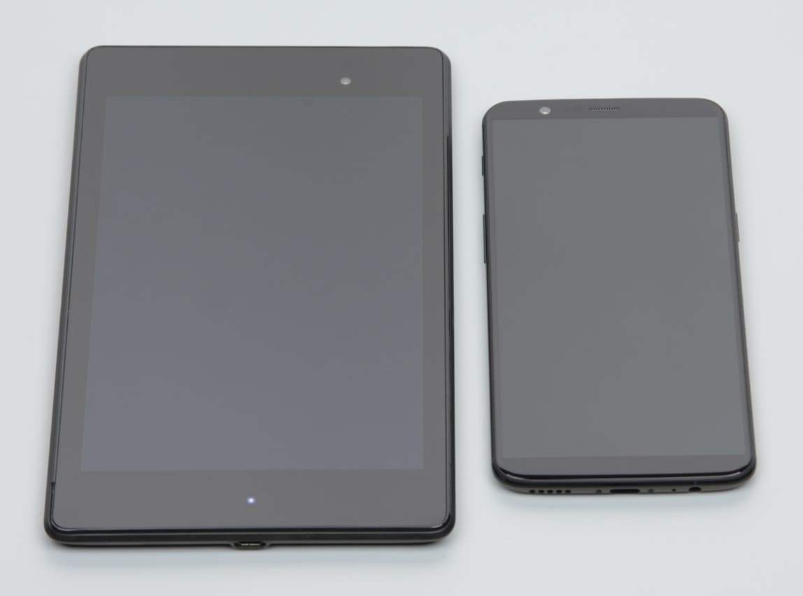 Лицевая поверхность экрана выполнена в виде стеклянной пластины с зеркально-гладкой поверхностью, устойчивой к появлению царапин. Судя по отражению объектов, антибликовые свойства экрана не хуже, чем у экрана Google Nexus 7 (2013) (ниже просто Nexus 7). Для наглядности приведем фотографию, на которой в выключенных экранах отражается белая поверхность (слева — Nexus 7, справа — OnePlus 5T, далее их можно различать по размеру):