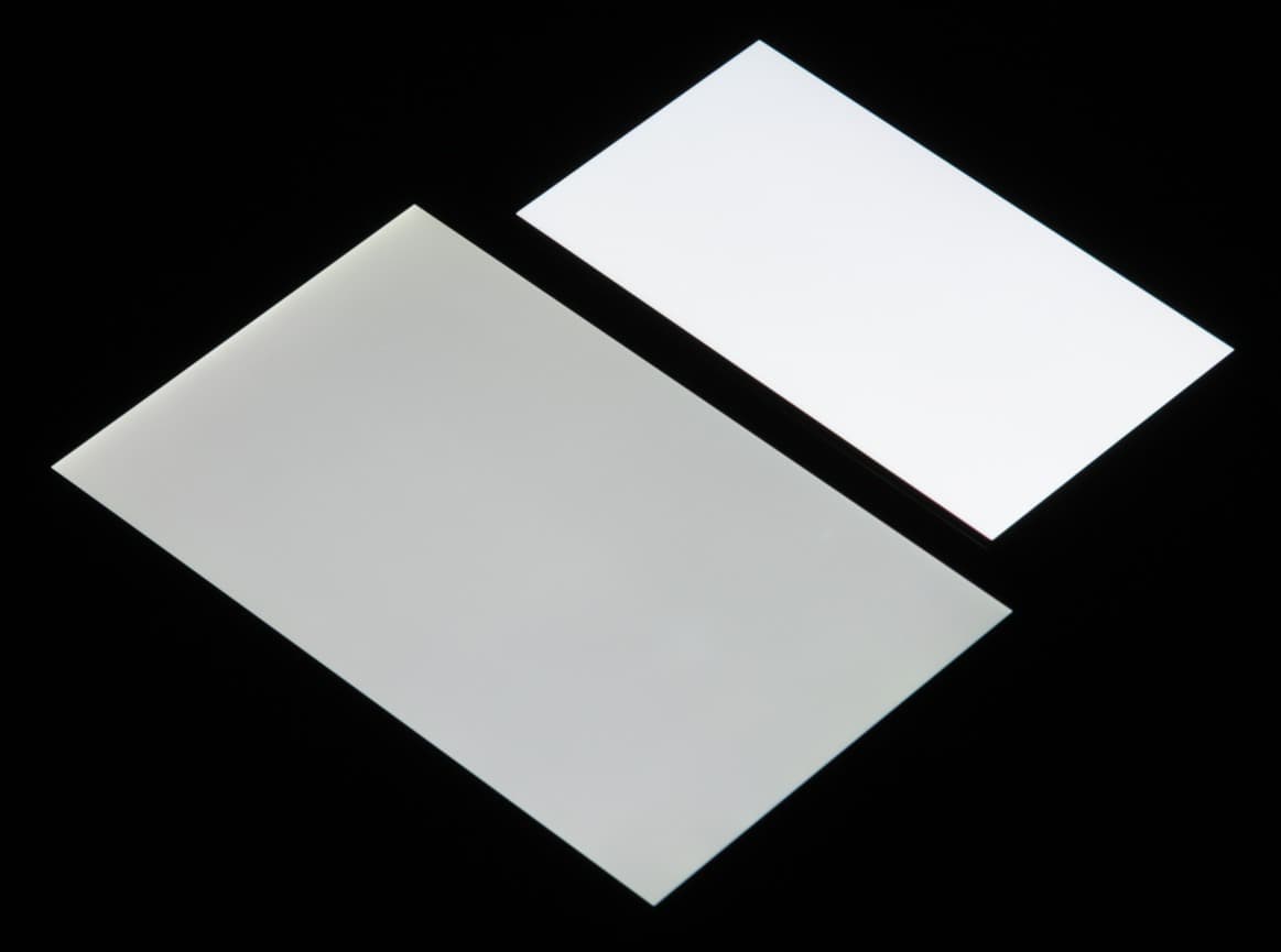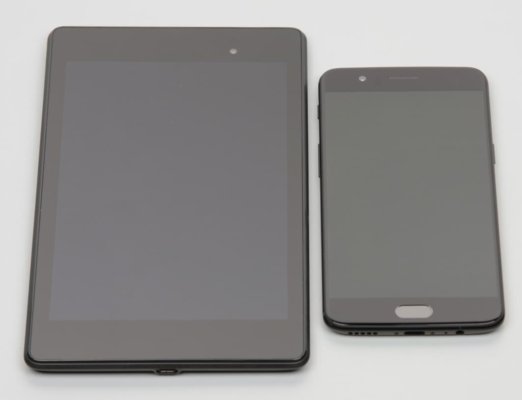 Лицевая поверхность экрана выполнена в виде стеклянной пластины с зеркально-гладкой поверхностью, устойчивой к появлению царапин. Судя по отражению объектов, антибликовые свойства экрана не хуже, чем у экрана Google Nexus 7 (2013) (ниже просто Nexus 7). Для наглядности приведем фотографию, на которой в выключенных экранах отражается белая поверхность (слева — Nexus 7, справа — OnePlus A5000, далее их можно различать по размеру):