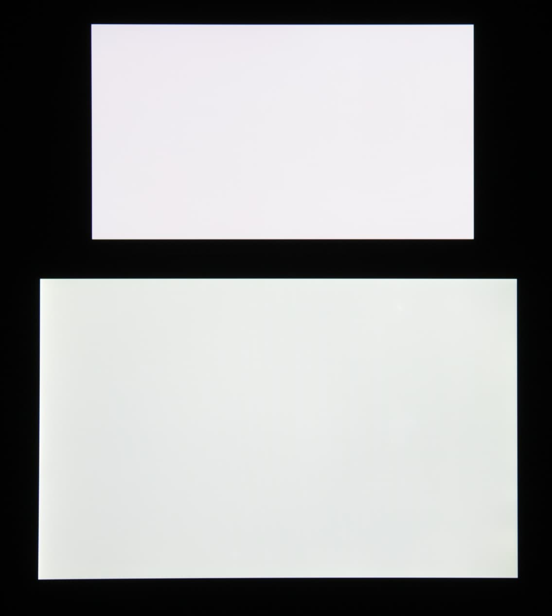Экран характеризуется великолепными углами обзора. Правда, белый цвет при отклонении даже на небольшие углы приобретает легкий сине-зеленый оттенок, а под некоторыми углами чуть-чуть розовеет, но черный цвет остается просто черным под любыми углами. Он настолько черный, что параметр контрастности в данном случае просто неприменим. Для сравнения приведем фотографии, на которых на экраны OnePlus A5000 и второго участника сравнения выведены одинаковые изображения, при этом яркость экранов изначально установлена примерно на 200 кд/м², а цветовой баланс на фотоаппарате принудительно переключен на 6500 К.